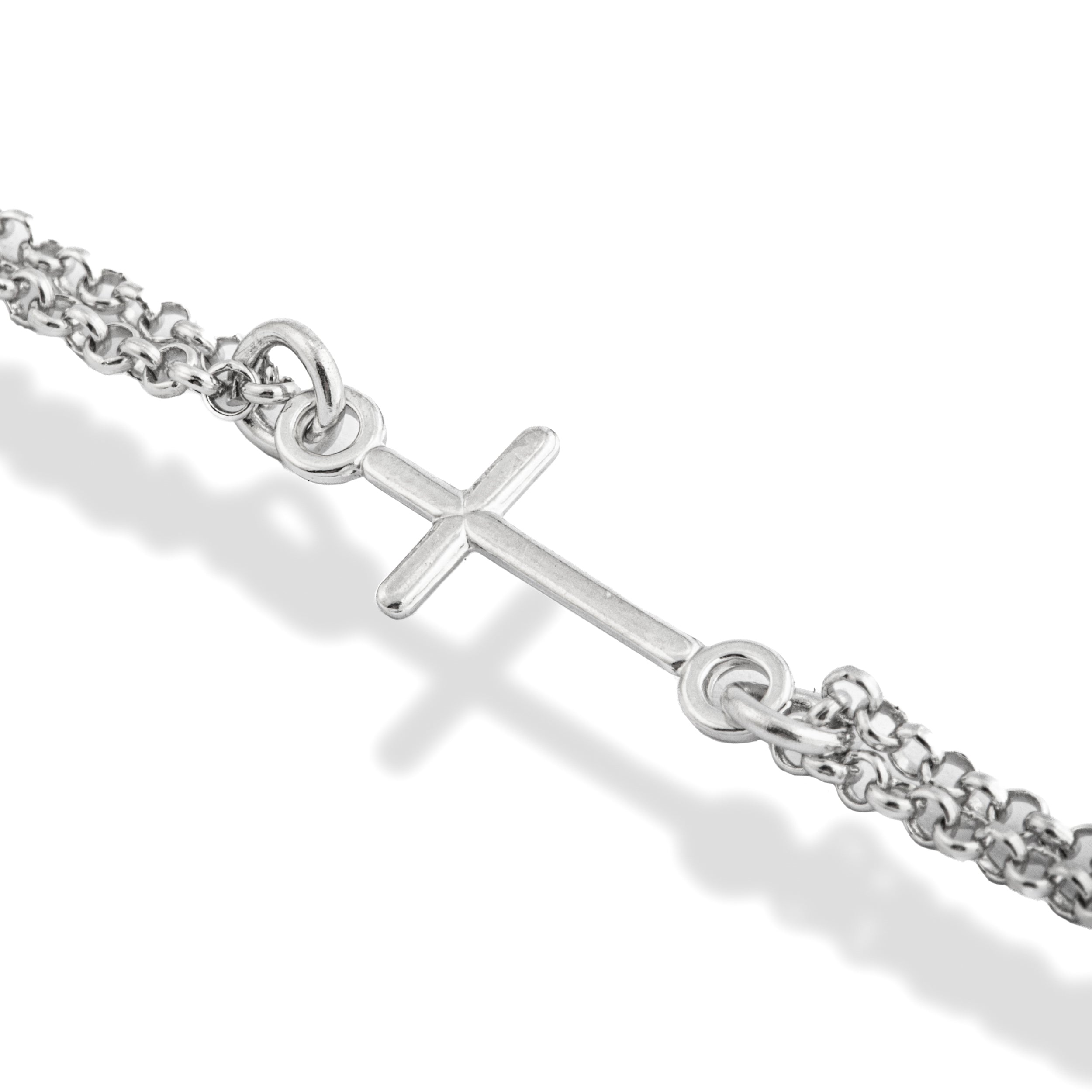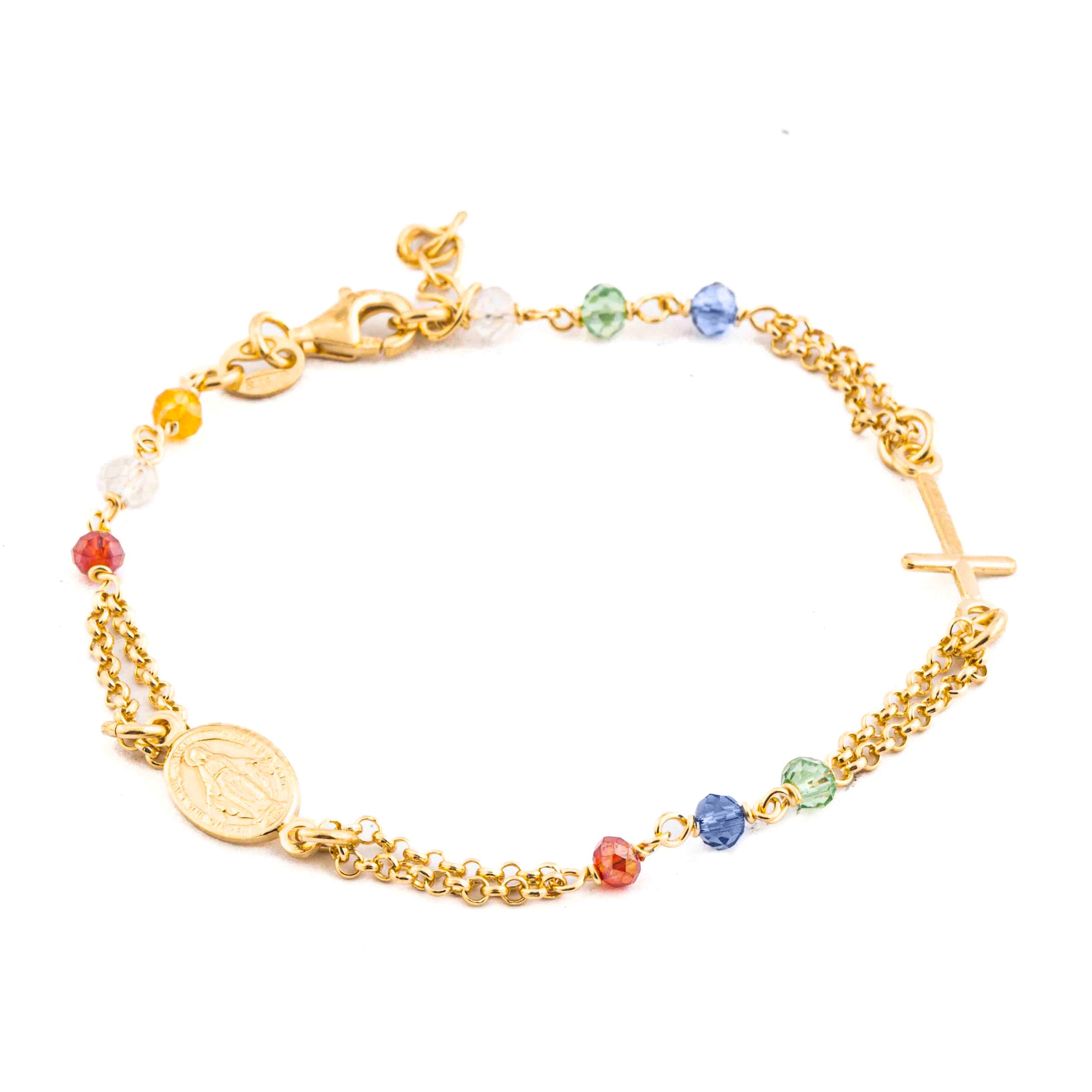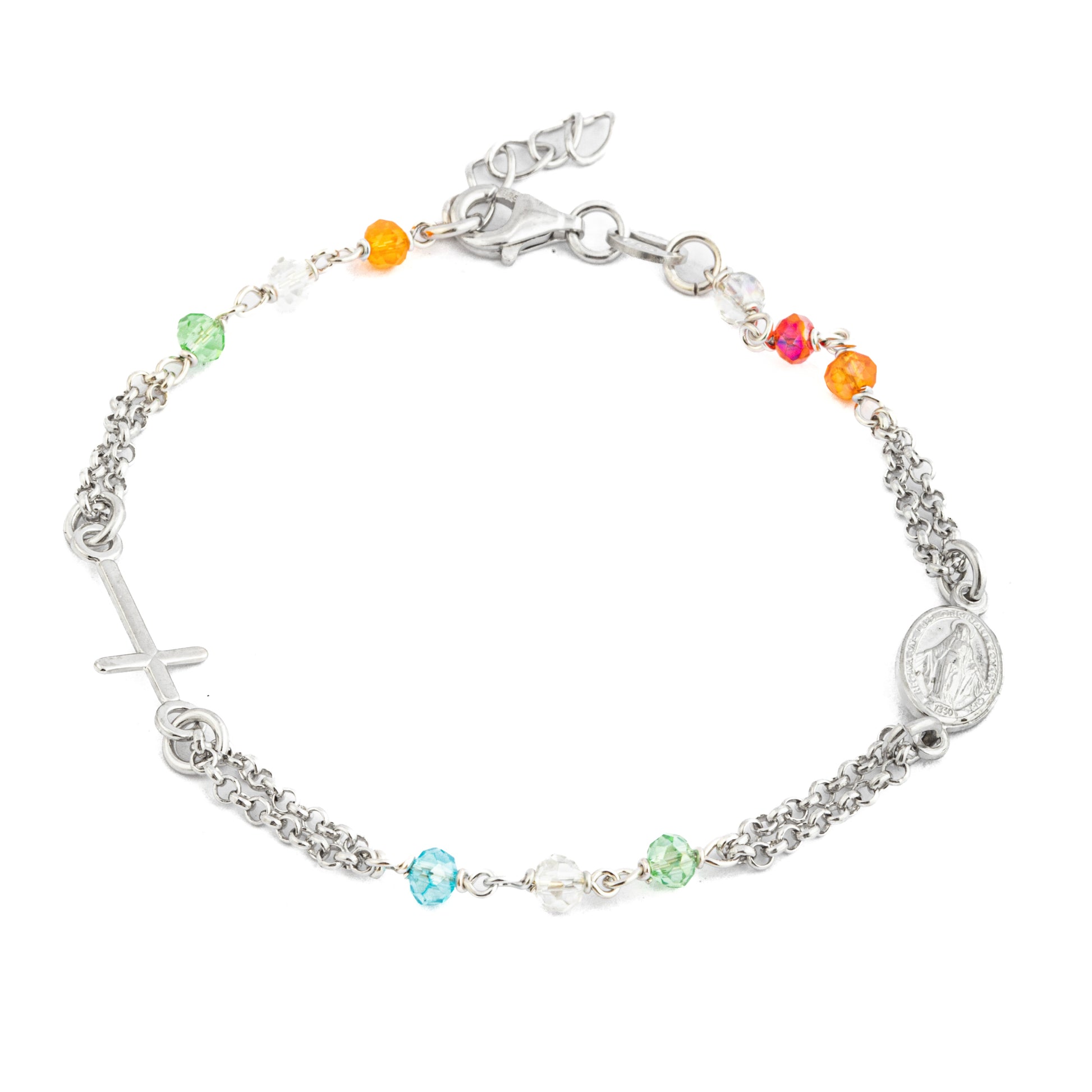 Exclusive 925 silver bracelet. With 3mm 3+3+3 faceted beads, this bracelet is embellished with a medal of the Miraculous Madonna and a cross. Made with high quality materials. Length: 17cm and extension: 2.5cm