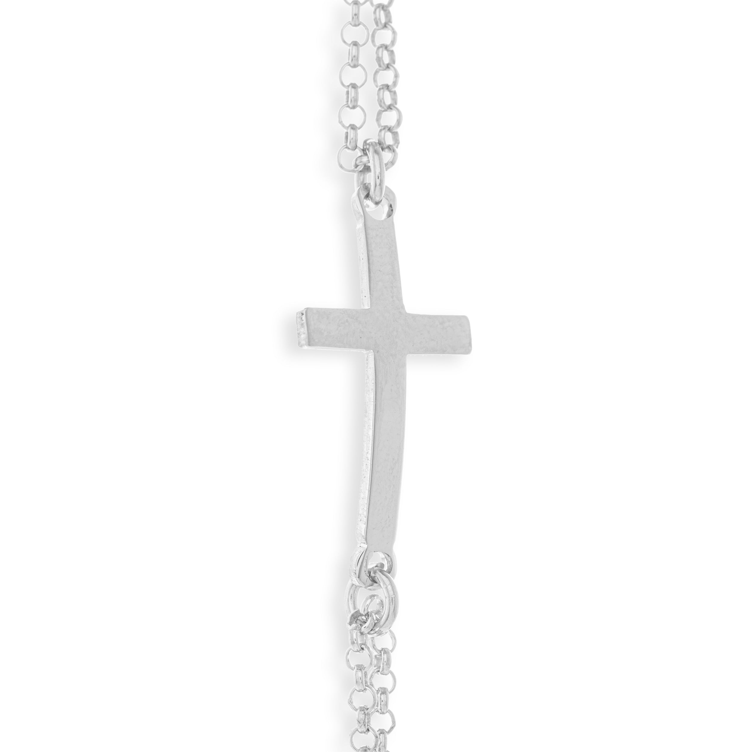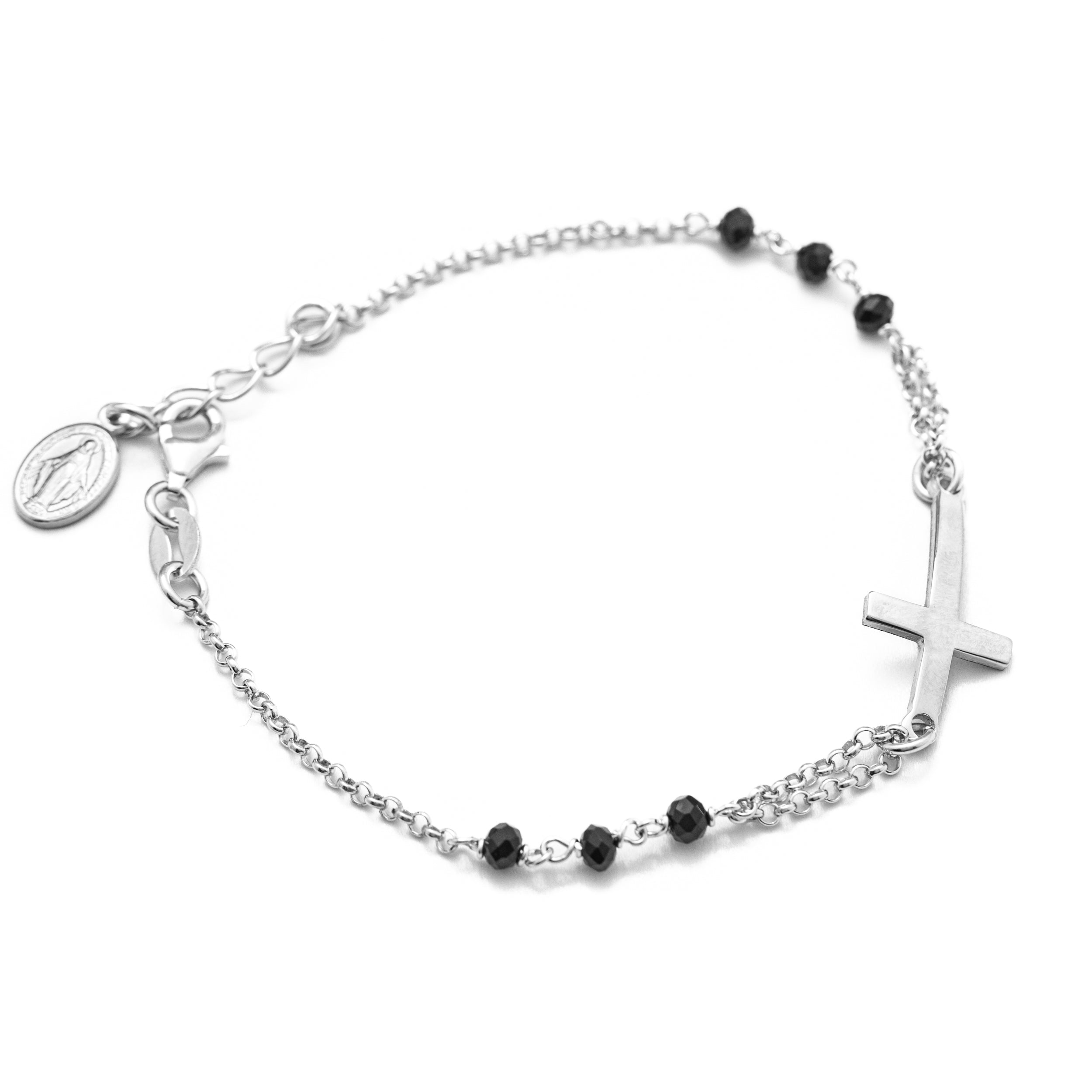Exclusive 925 silver bracelet. With 3 + 3 3mm beads, this bracelet is embellished with a medal of the Miraculous Madonna and a cross. Made with high quality materials. Length 17cm and extension with pendant 3cm