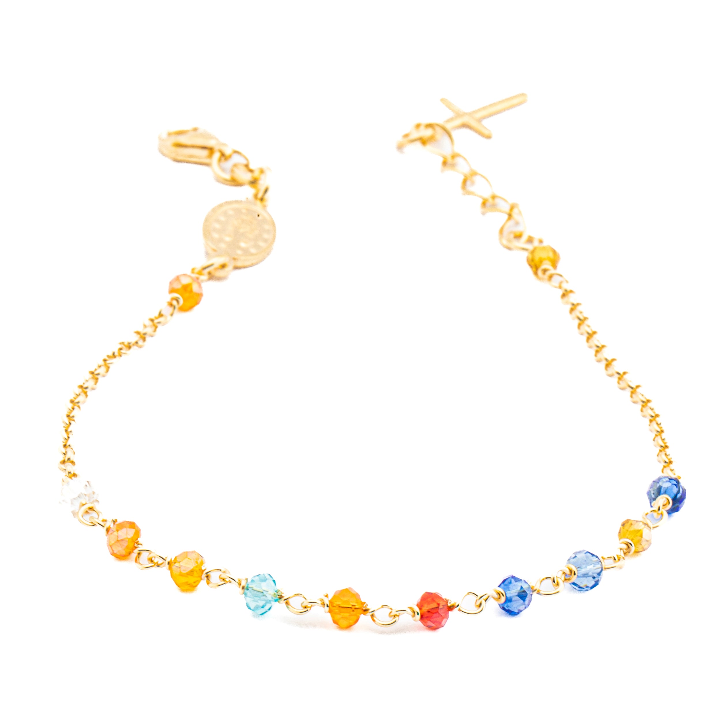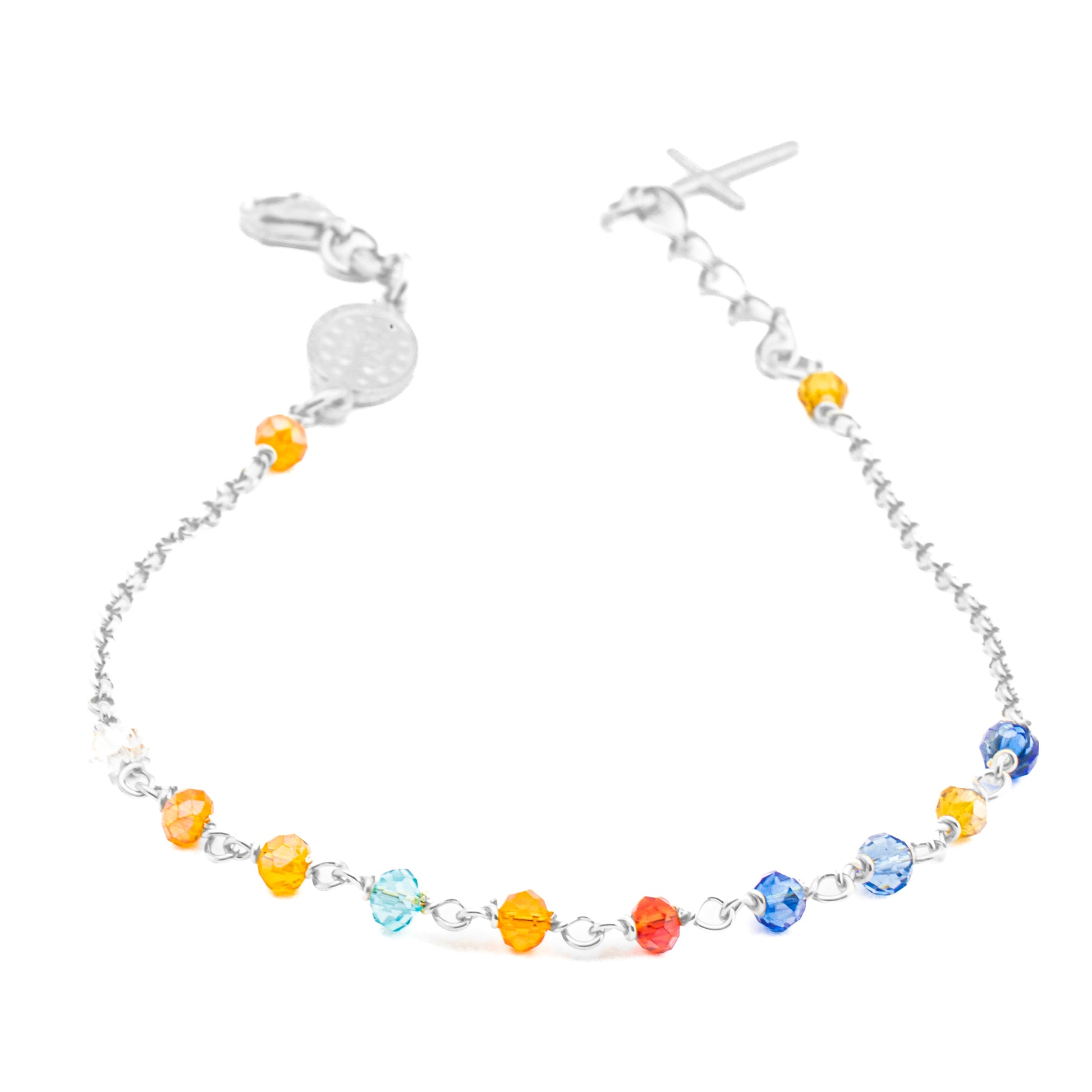 Exclusive 925 silver bracelet. With ten 3mm multicolored beads, this bracelet is embellished with a medal of the Miraculous Madonna. Made with high quality materials. Length 18cm and extension with pendant cross 3cm