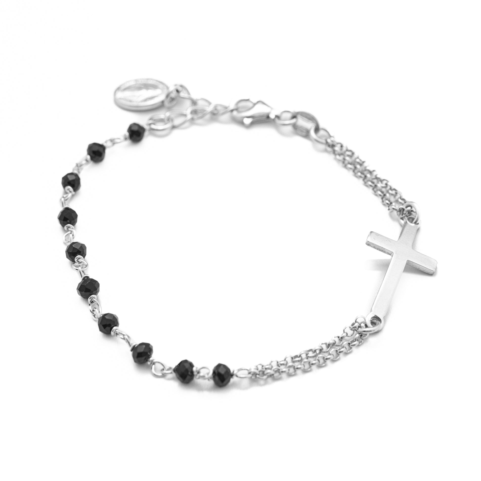 Esclusivo bracciale in argento 925. Con grani a decina da 3mm, questo bracciale è impreziosito da una croce e una medaglia della Madonna Miracolosa pendente. Realizzato con materiali di alta qualità. Lunghezza cm e estensione con pendente 3cm