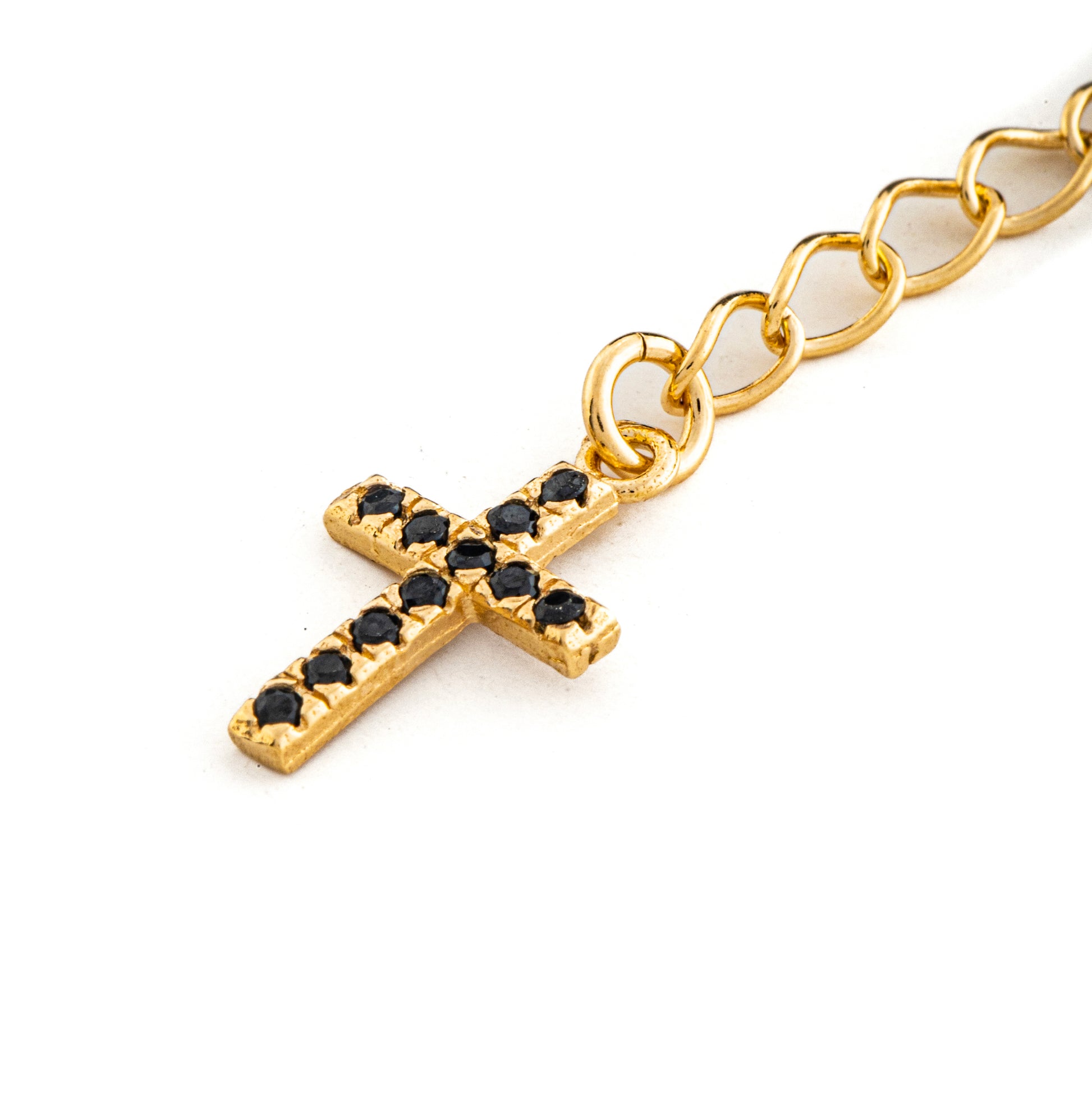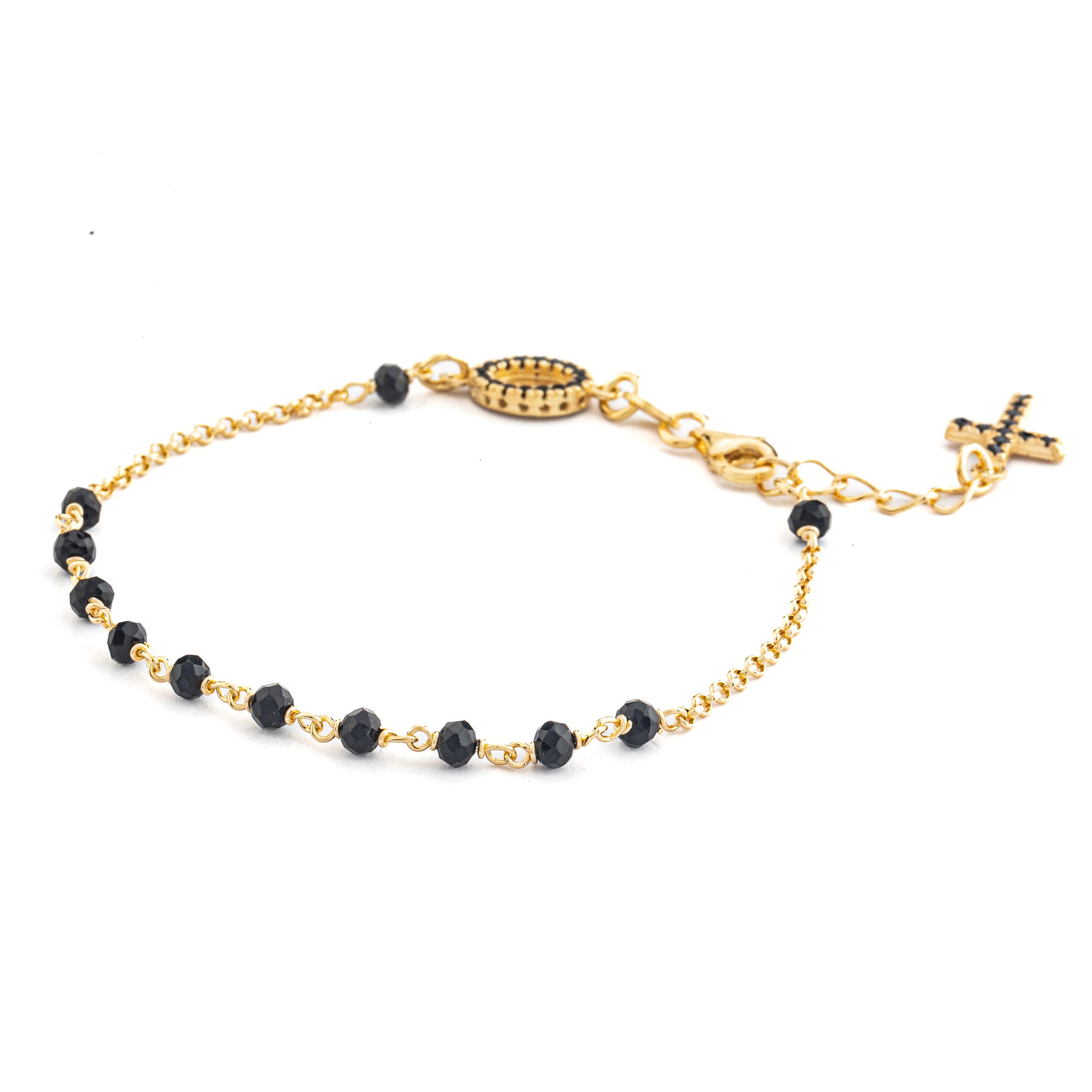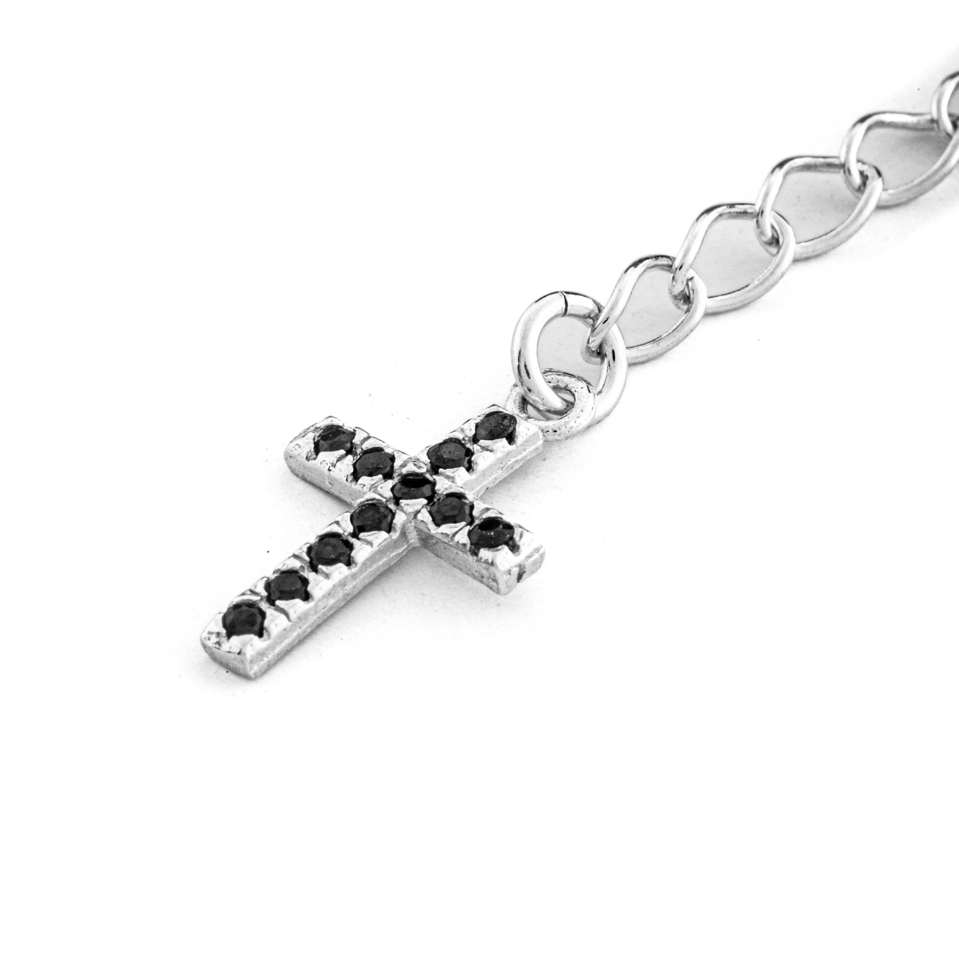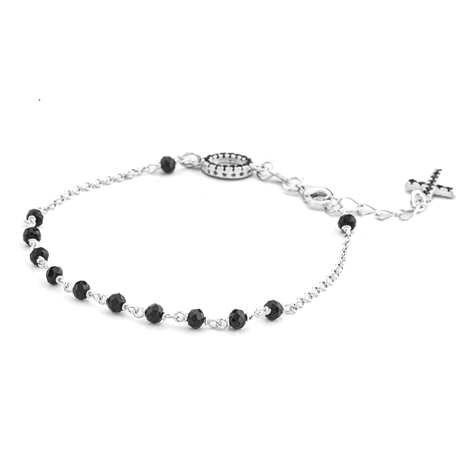 Esclusivo bracciale in argento 925. Con grani a decina da 3mm, questo bracciale è impreziosito da una medaglia della Madonna Miracolosa e croce pendente con zirconi neri. Realizzato con materiali di alta qualità. Lunghezza: 17cm e estensione con croce pendente 3cm