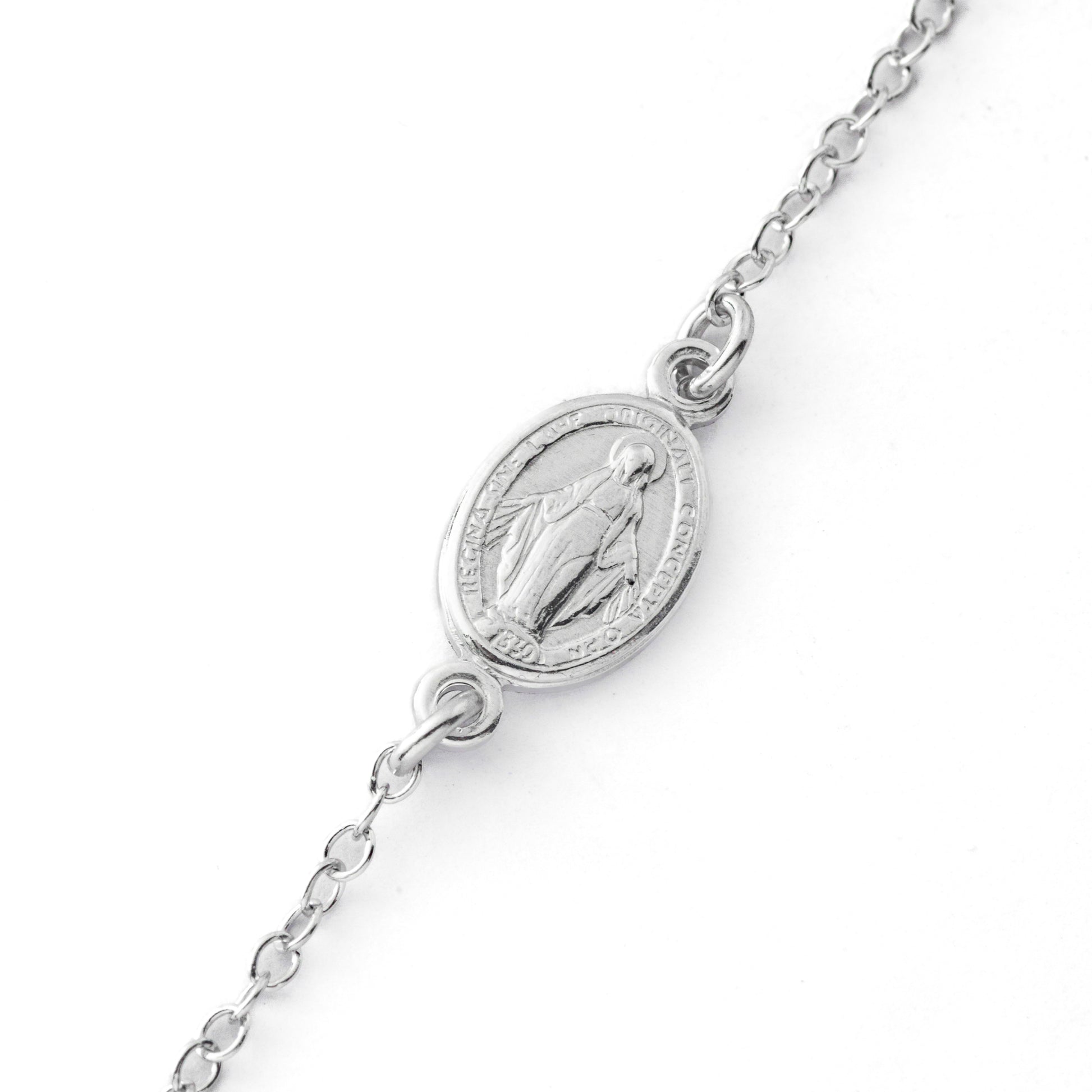 Esclusivo bracciale in argento 925. Con grani a 3 + 3 da 2mm, questo bracciale è impreziosito da una medaglia della Madonna Miracolosa e una Croce. Realizzato con materiali di alta qualità. Lunghezza 17cm e estensione con pendente 2cm