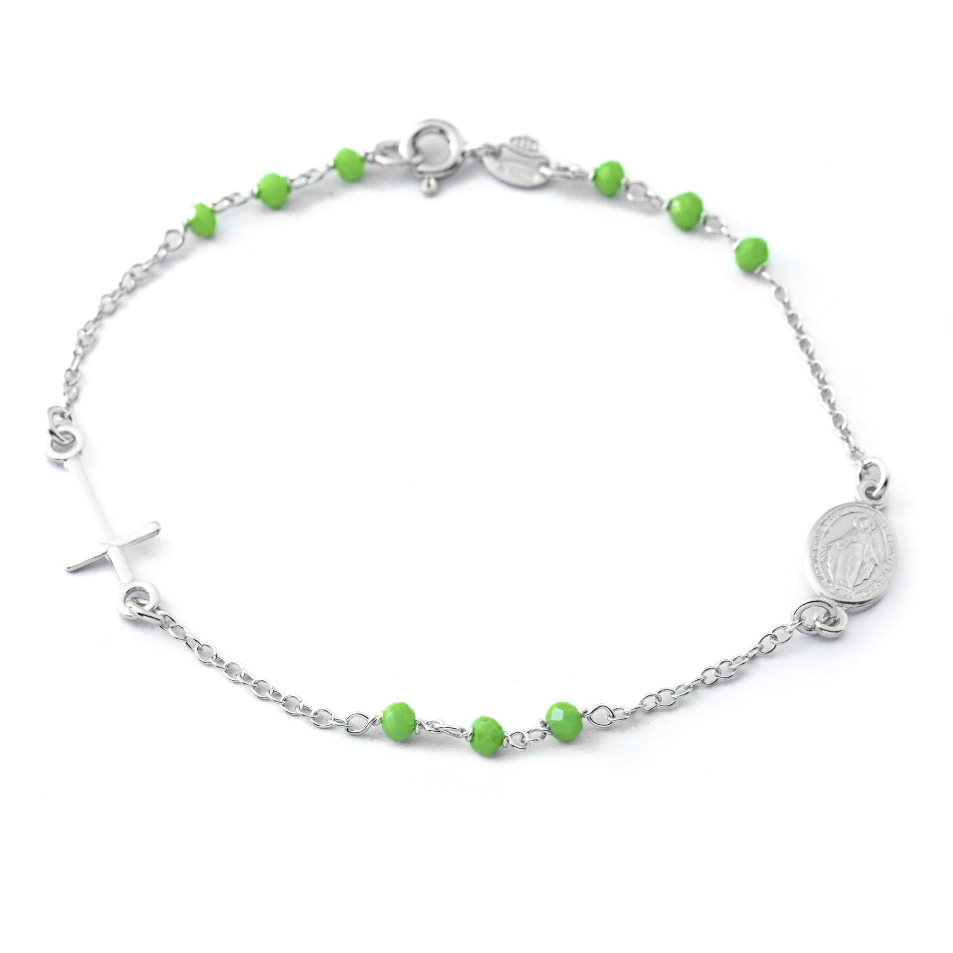 Bracciali argento 925. Con grani Verde da 2mm e Madonna Miracolosa