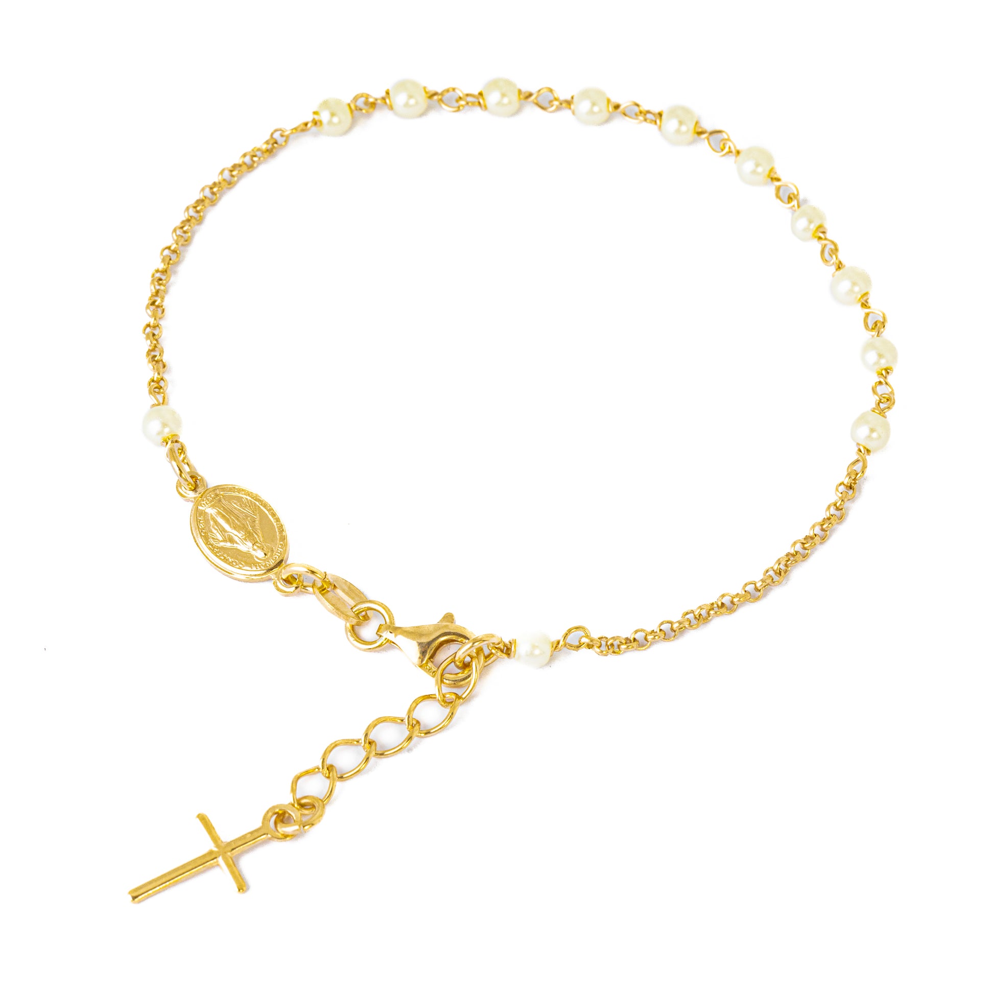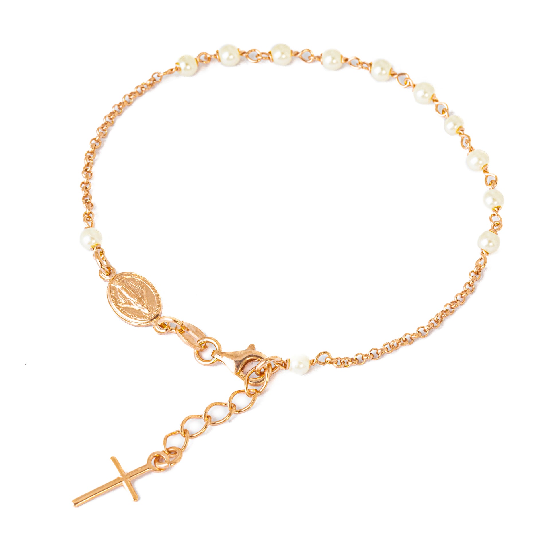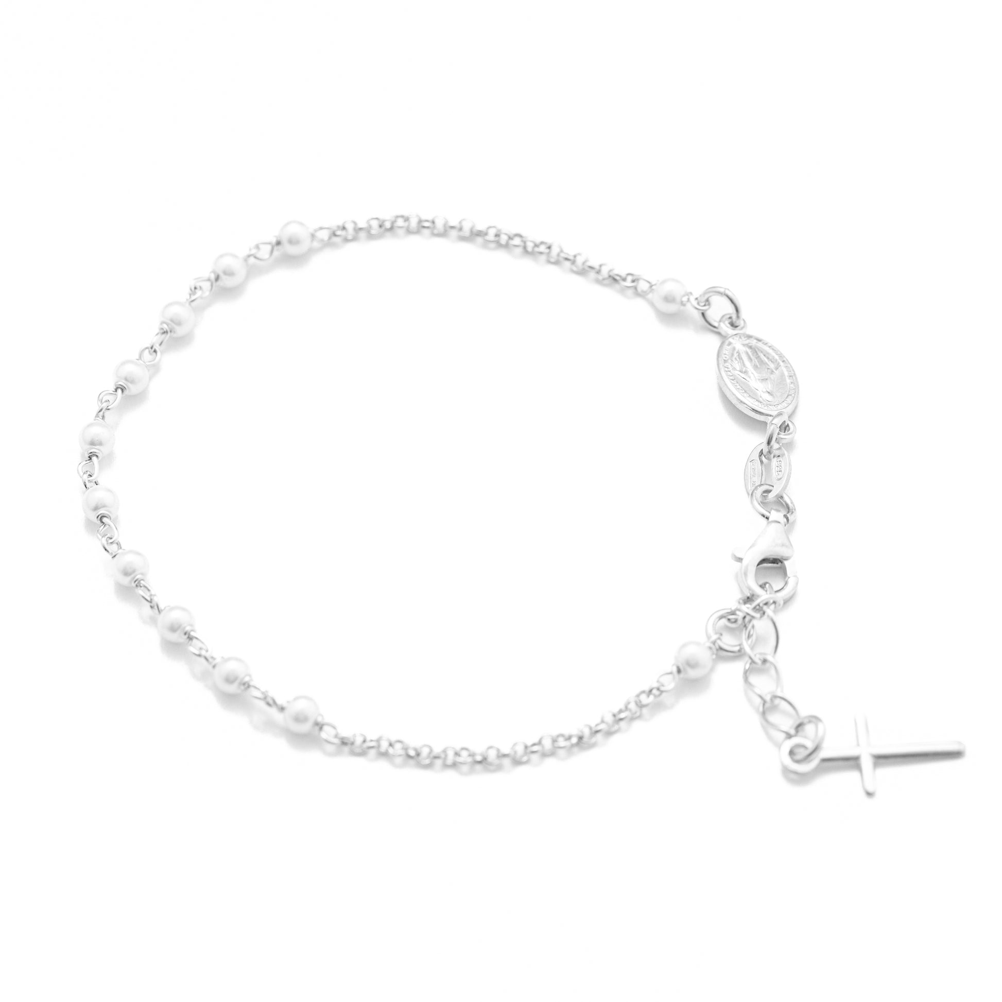 Esclusivo bracciale in argento 925. Con perlina finta da 2,50mm, questo bracciale è impreziosito da una Madonna e una croceta pendente. Realizzato con materiali di alta qualità. Estensione con pendente 3cm