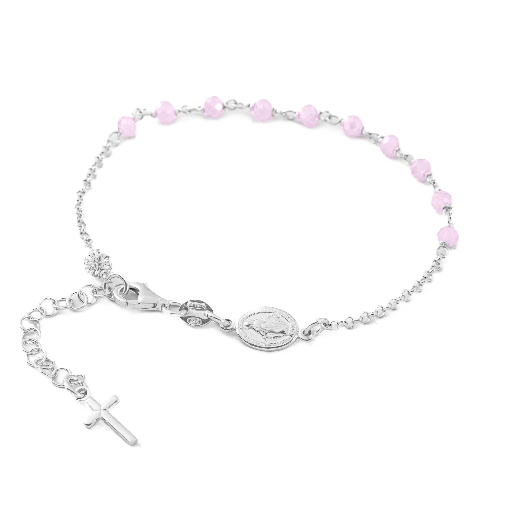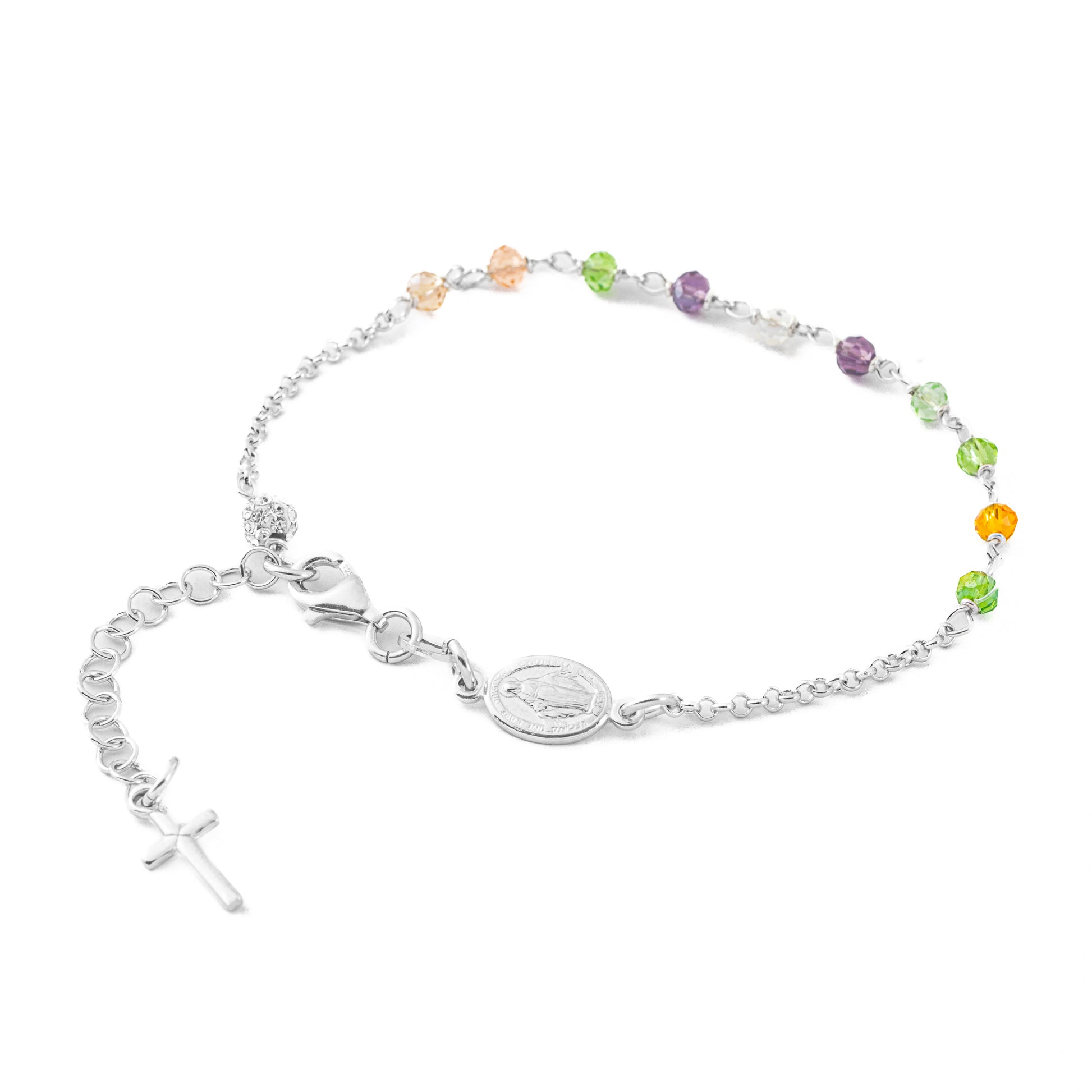 Esclusivo bracciale in argento 925. Con grani a decina da 3mm, questo bracciale è impreziosito da una medaglia della Madonna Miracolosa e grano con cristalli. Realizzato con materiali di alta qualità. Lunghezza 17,5cm e estensione con croce pendente 3cm