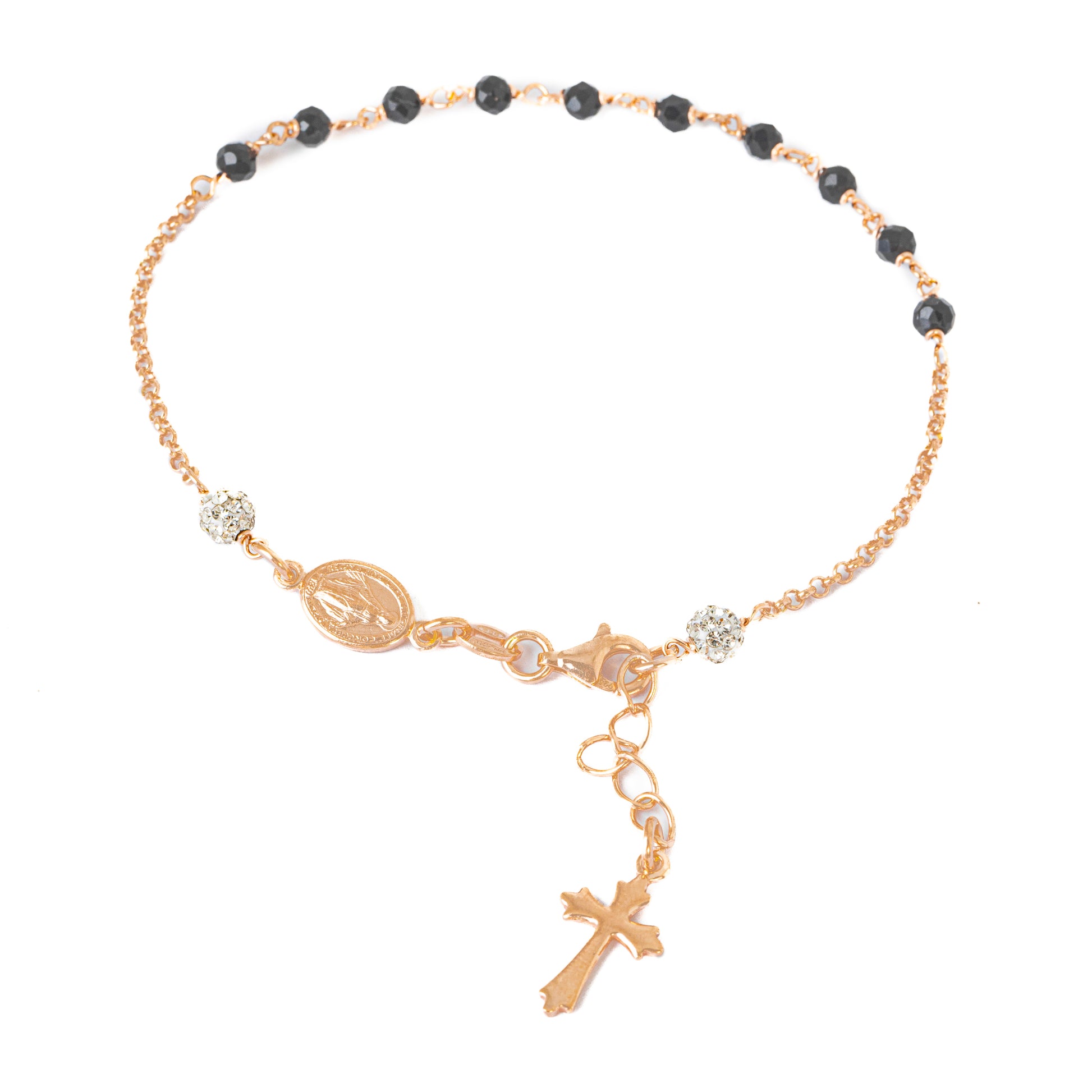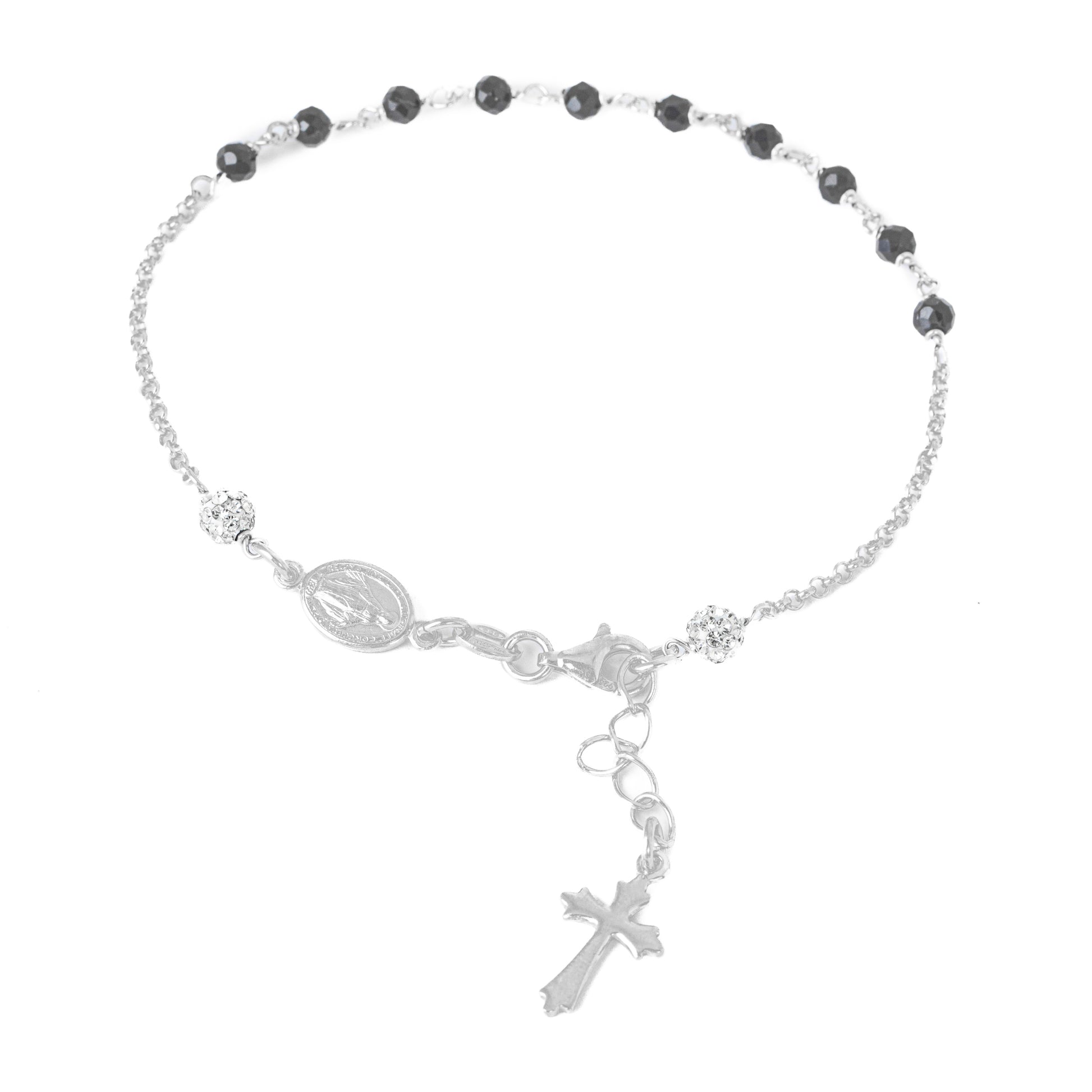 Esclusivo bracciale in argento 925. Con grani a decina da 3mm, questo bracciale è impreziosito da una medaglia della Madonna Miracolosa e 2 grani con cristalli. Realizzato con materiali di alta qualità. Lunghezza 17,5cm e estensione con croce pendente 3cm