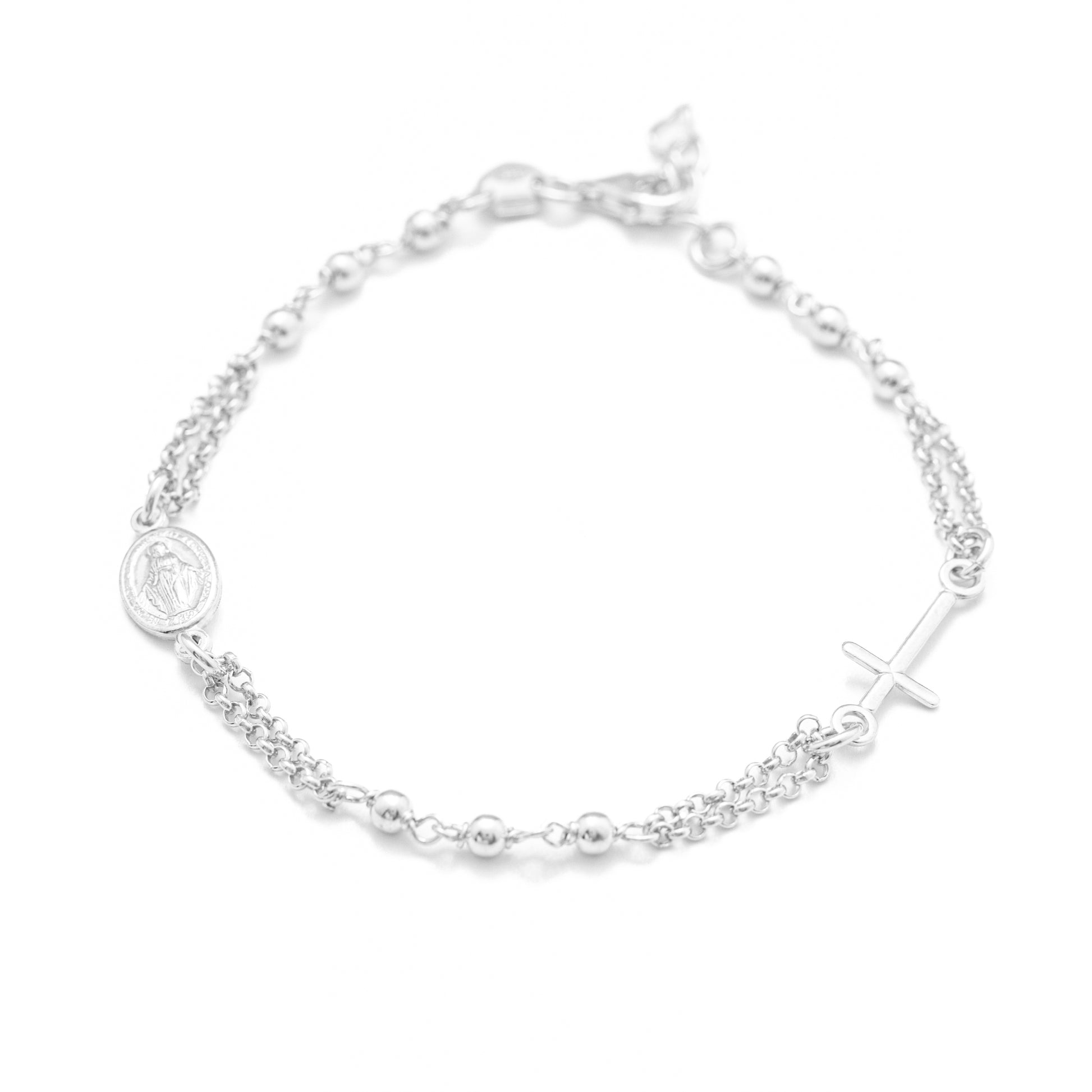 Esclusivo bracciale in argento 925. Con 9 grani da 2,5mm, questo bracciale è impreziosito da una medaglia della Madonna Miracolosa e una Croce . Realizzato con materiali di alta qualità. Lunghezza 17cm.