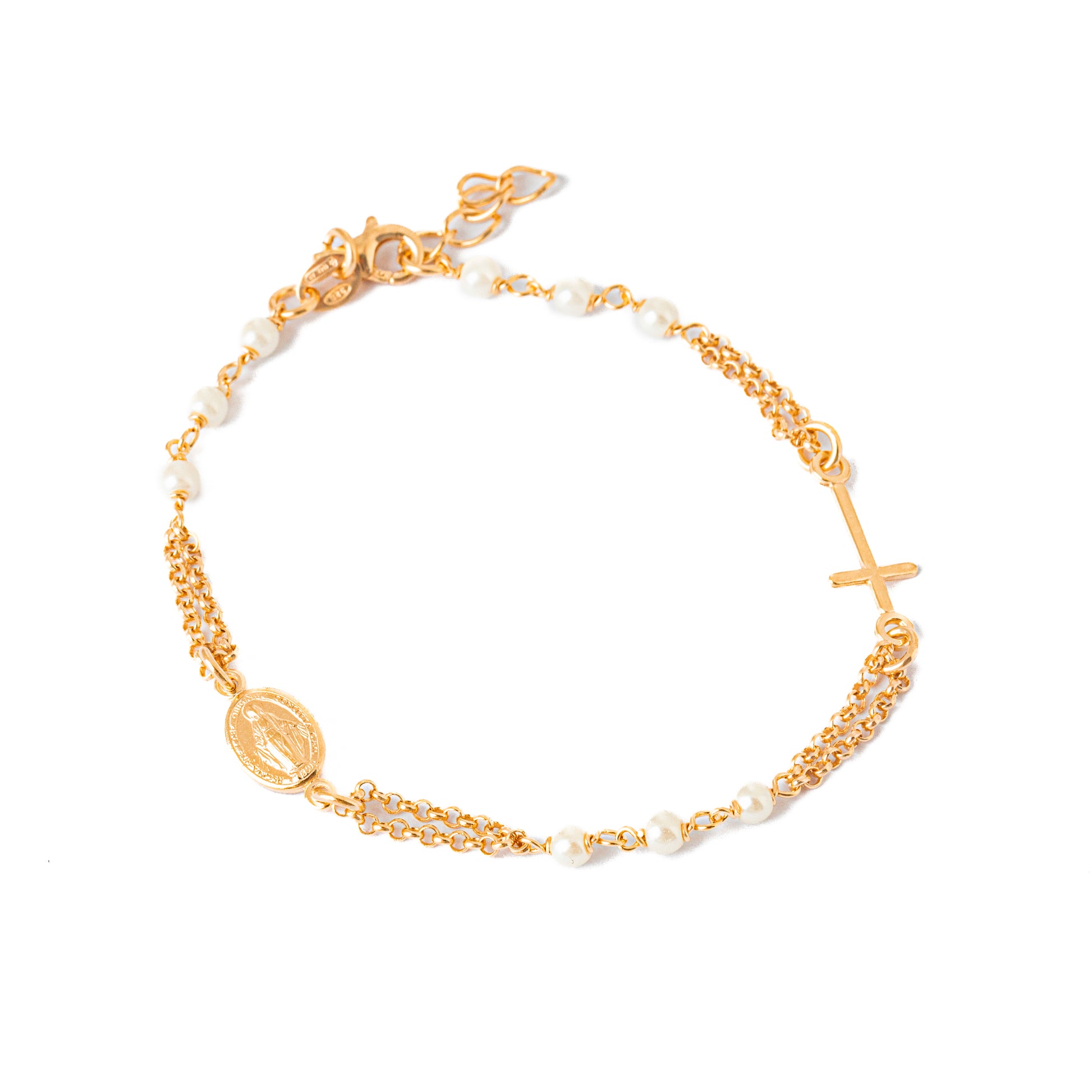 Esclusivo bracciale in argento 925. Con grani perla sintetica a 3 +3 +3 da 3mm, questo bracciale è impreziosito da una medaglia della Madonna Miracolosa e una croce. Realizzato con materiali di alta qualità. Lunghezza:17cm e estensione: 2,5cm