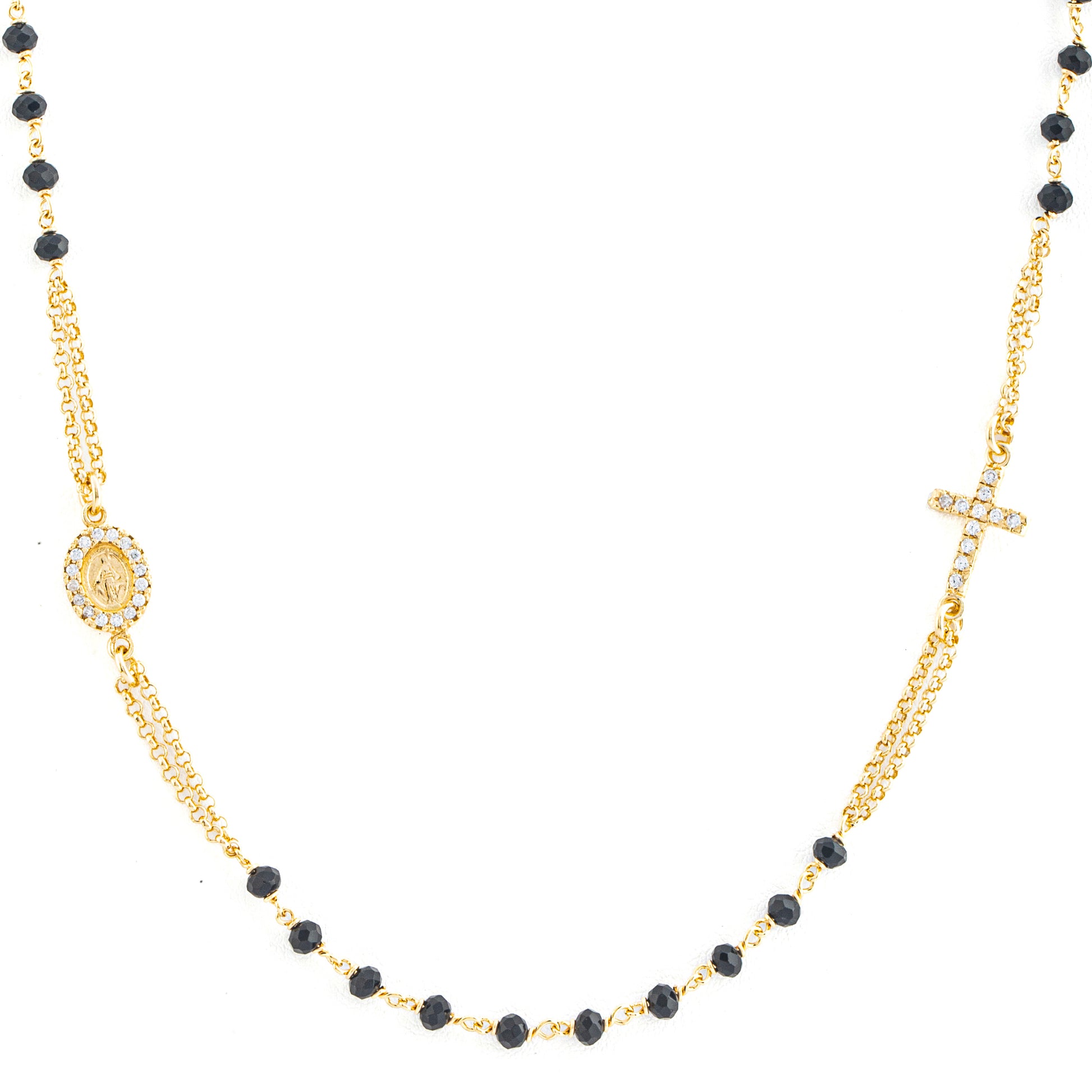 Esclusiva Collana Rosario in Argento 925 di alta qualità. Questo gioiello raffinato presenta una Madonna Miracolosa e una croce, arricchite da zirconi bianchi scintillanti. Realizzata con grani neri da 3mm e un elegante design a doppio filo, questa collana offre un aspetto sofisticato e unico. Con una lunghezza di 46cm e un'estensione aggiuntiva di 5cm, assicura una vestibilità comoda e personalizzabile.
