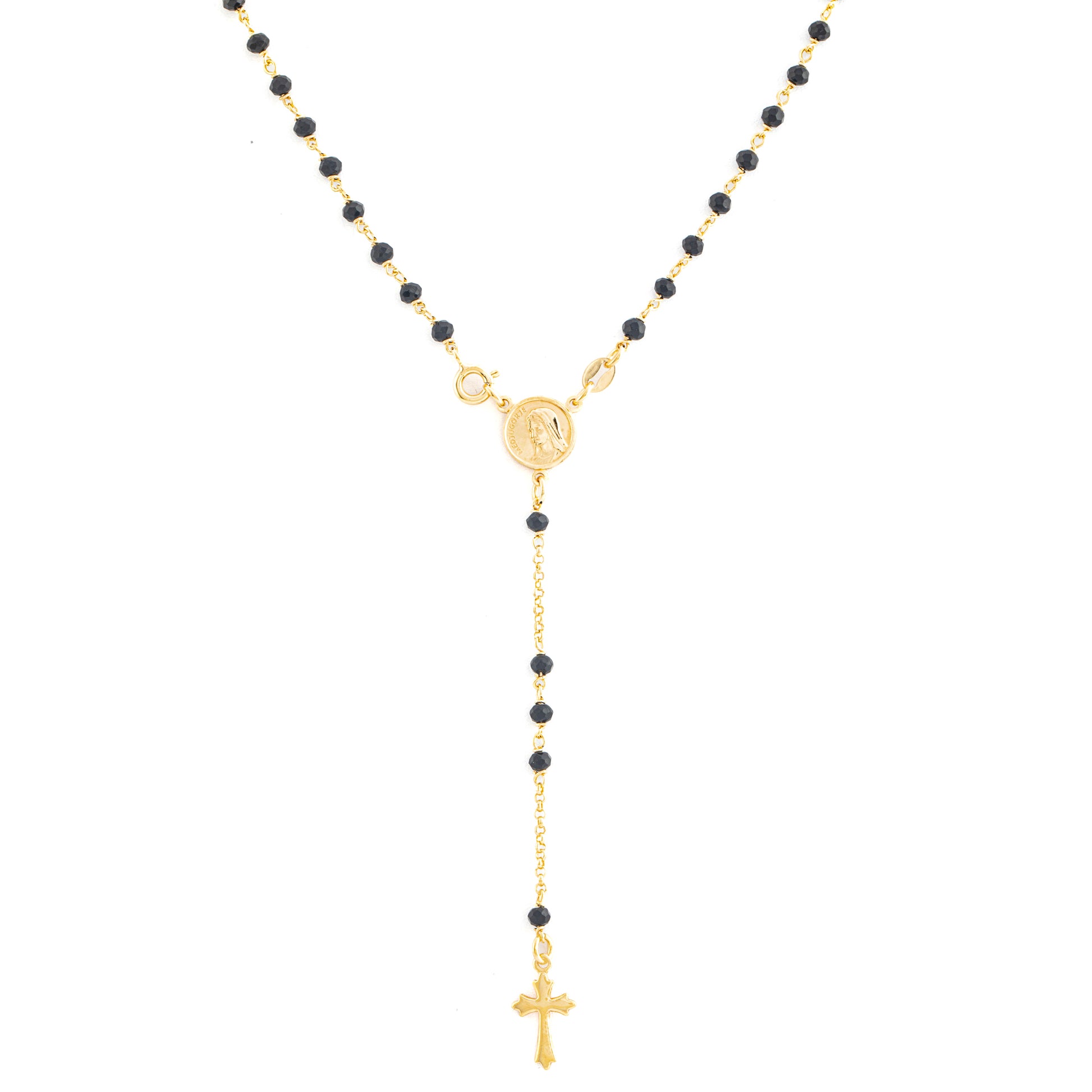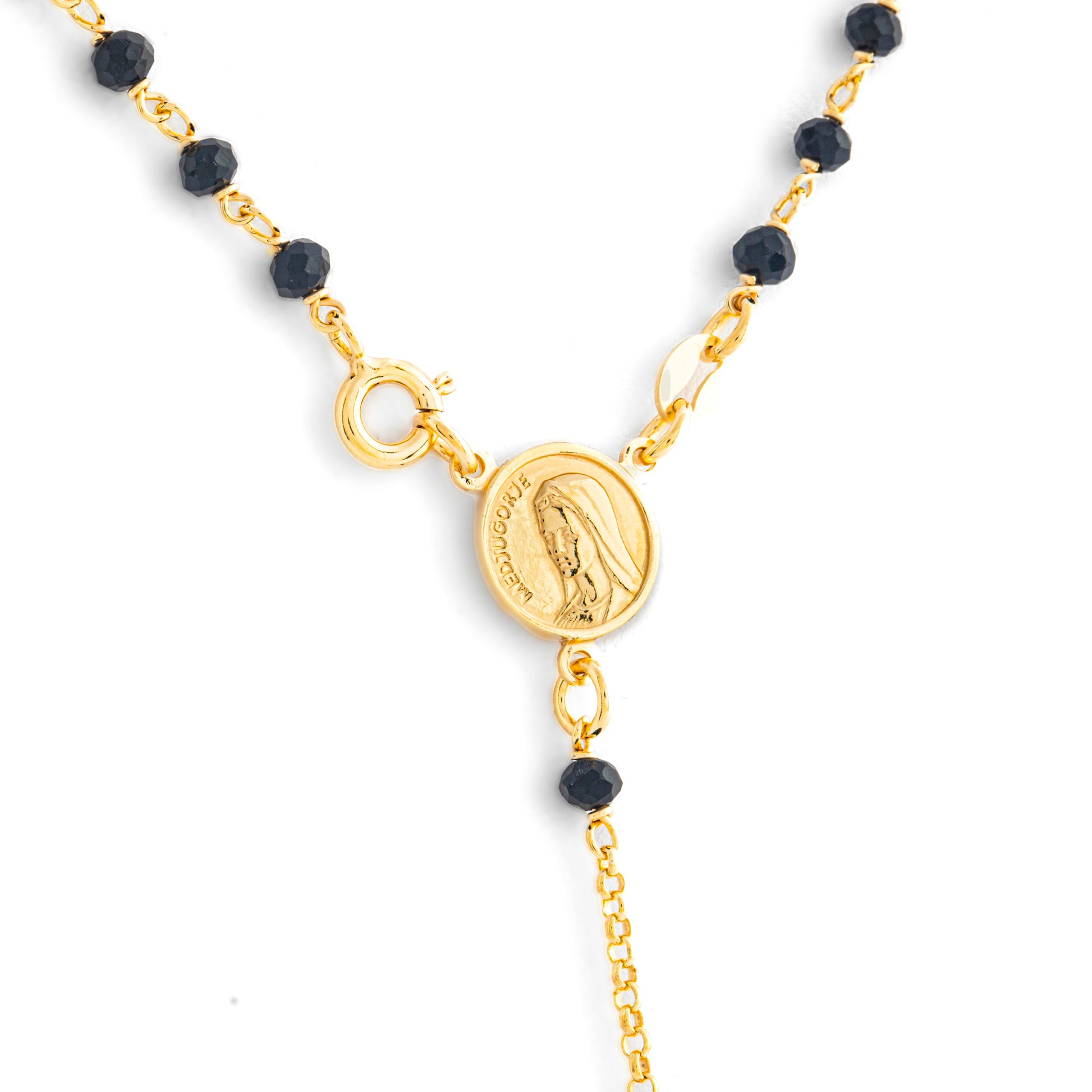 Rosario Argento 925 con Grani Neri da 3,5mm e Medaglia della Madoonna di Medjugorje. I grani neri da 3,5mm aggiungono un tocco di eleganza. Con una lunghezza di 50cm, questo rosario è perfetto per essere indossato comodamente ogni giorno. L'apertura frontale dell'anello moschettone garantisce una chiusura sicura e senza sforzo, mentre la finitura dorata aggiunge un tocco di luminosità e preziosità al gioiello.