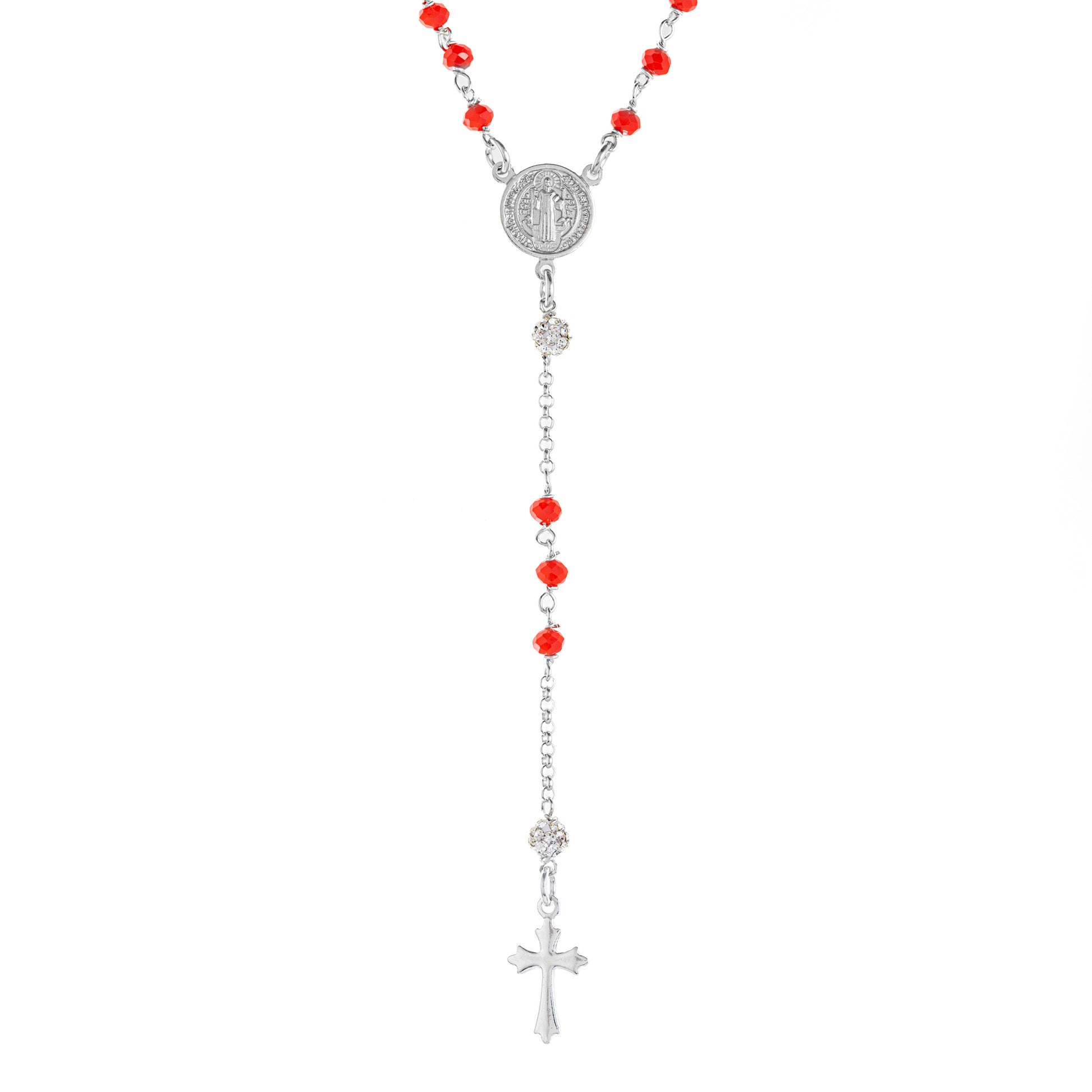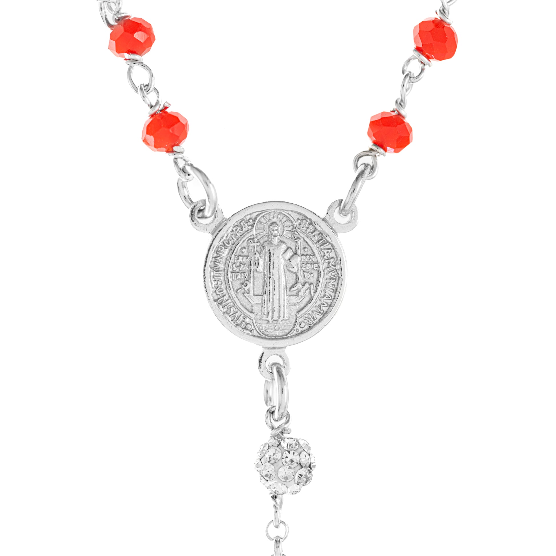 Rosario Argento 925 con Grani da 3,5mm e Medaglia di San Benedetto. Rosso.
