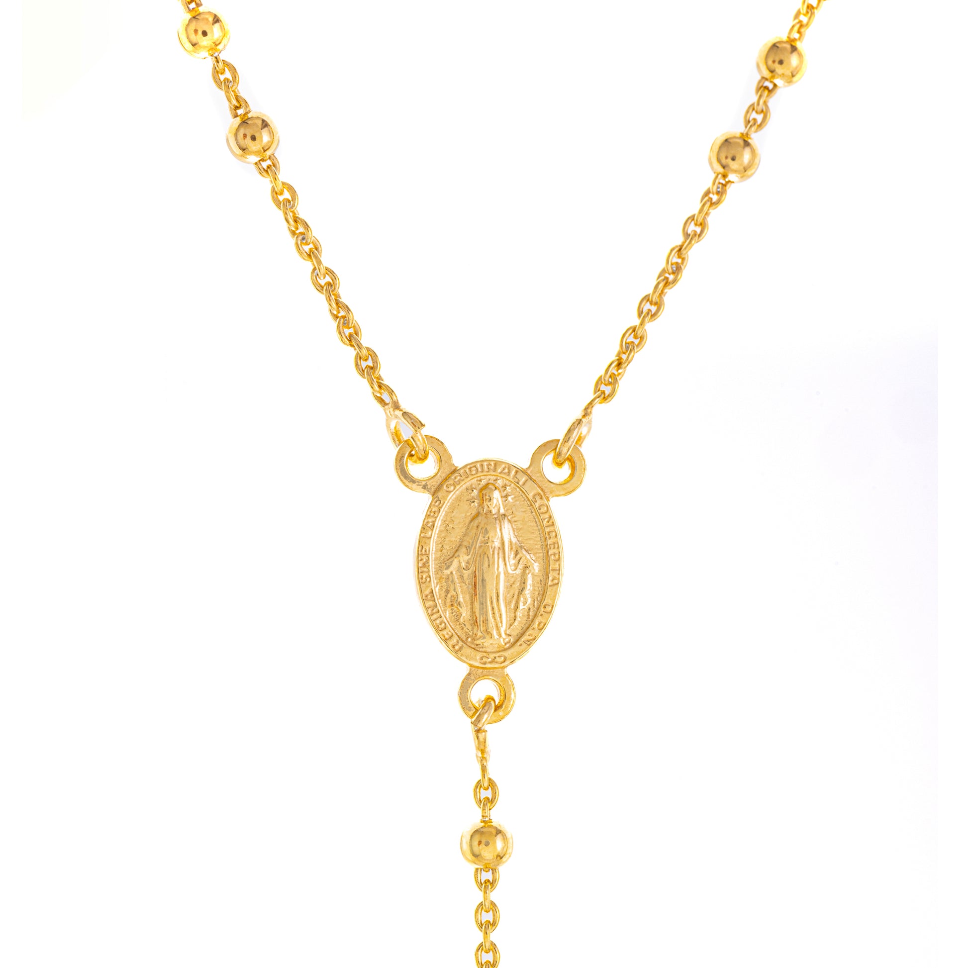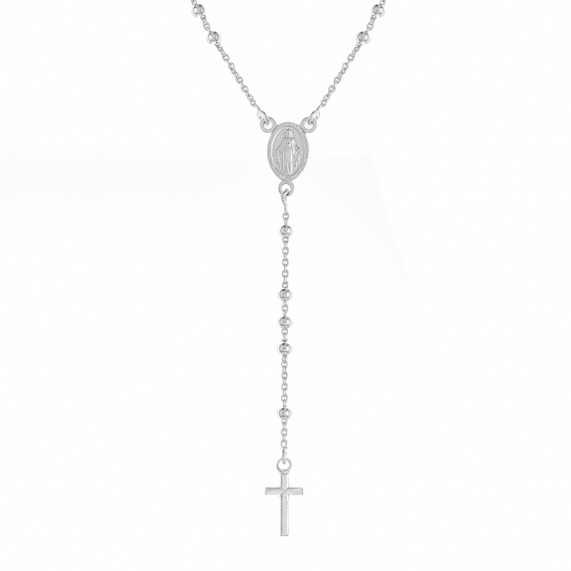 Esclusivo Rosario Argento 925. Realizzato con grani finemente lavorati, ciascuno di 2,5 mm di diametro. Il centro del rosario presenta una delicata medaglia della Madonna Miracolosa, simbolo di protezione e benedizione. Lunghezza di 46 cm. Il comodo moschettone ti permette di indossarlo con facilità e sicurezza.