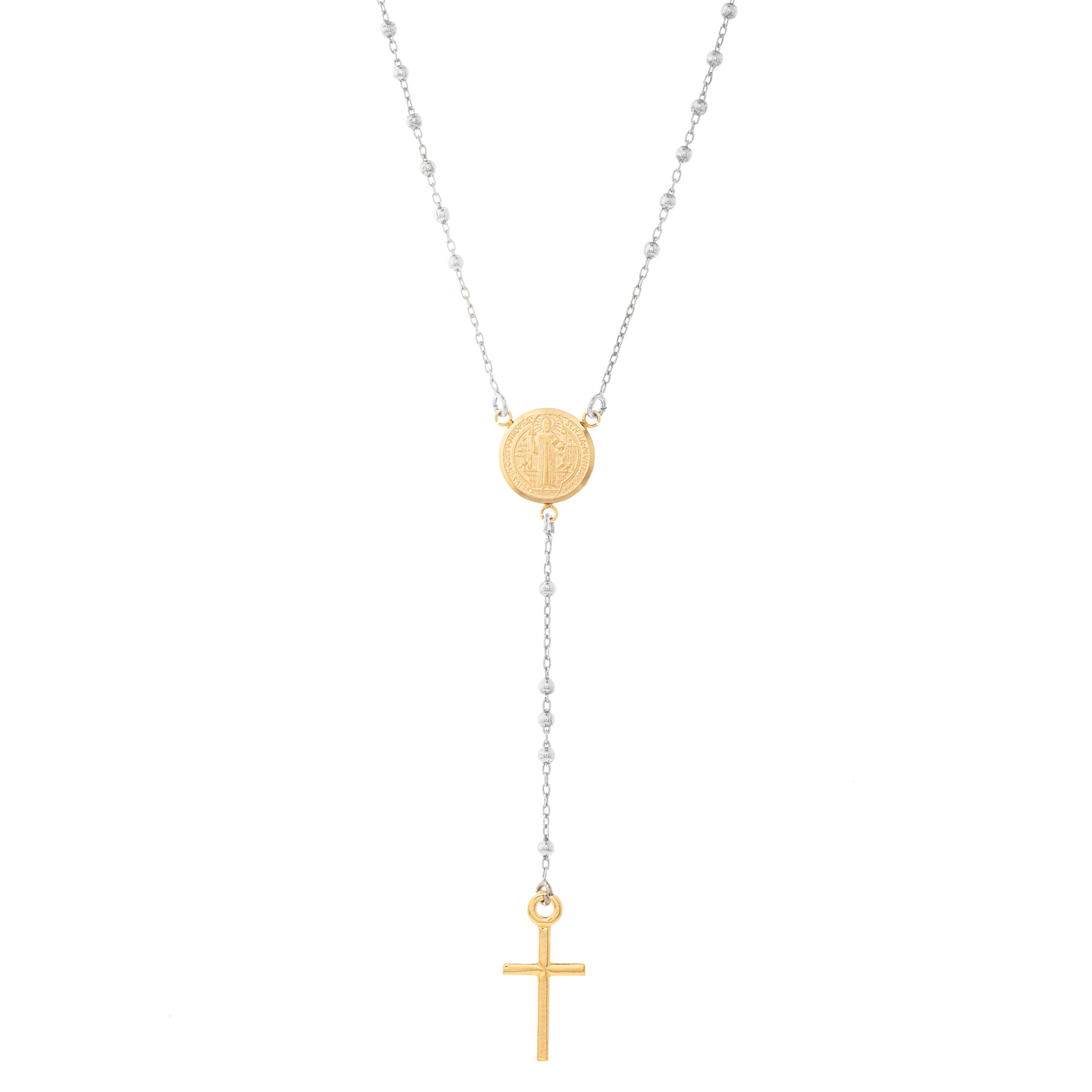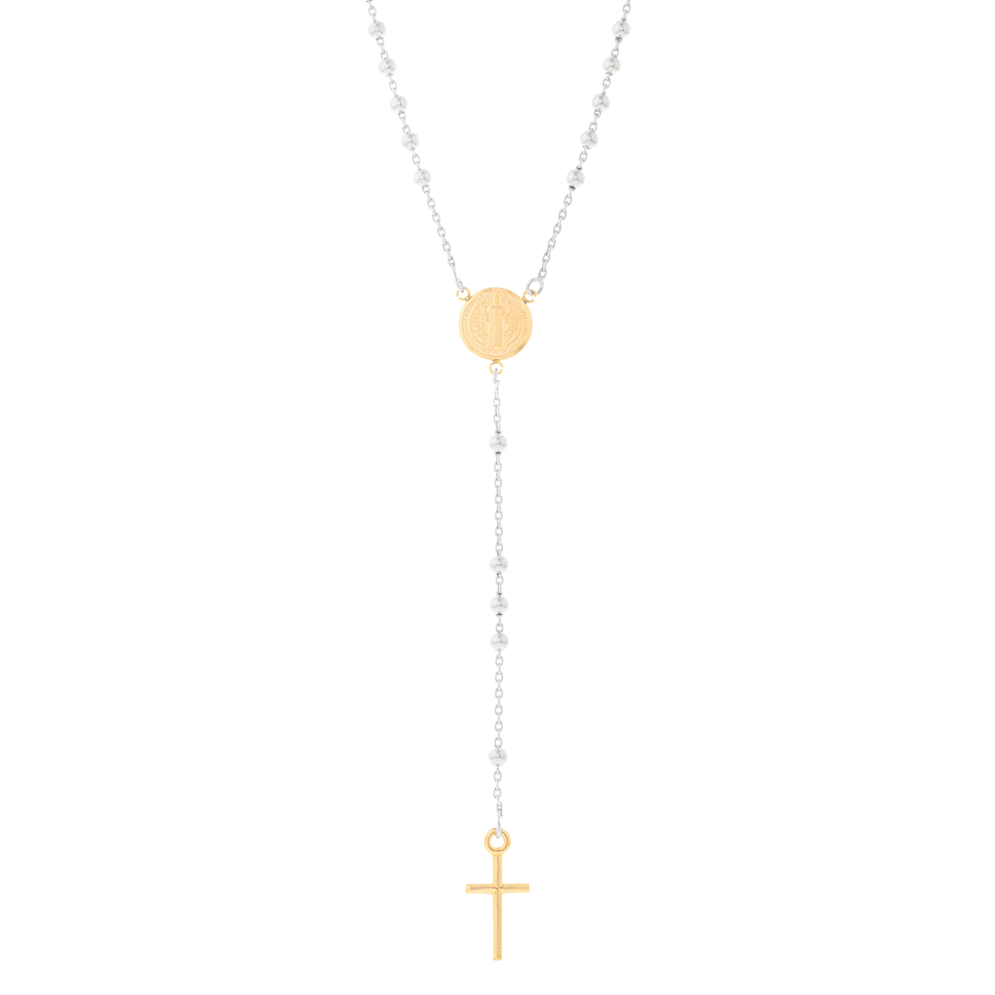 Rosario Argento 925, arricchito da una raffinata medaglia di San Benedetto e un pendente a croce. I grani di 2 mm sono finemente lavorati. La medaglia di San Benedetto e simbolo di protezione. Con una lunghezza di 46 cm, questo rosario è ideale per l'uso quotidiano o per regalare un dono significativo a una persona cara. Il comodo moschettone garantisce una facile apertura e chiusura per una vestibilità senza sforzo.
