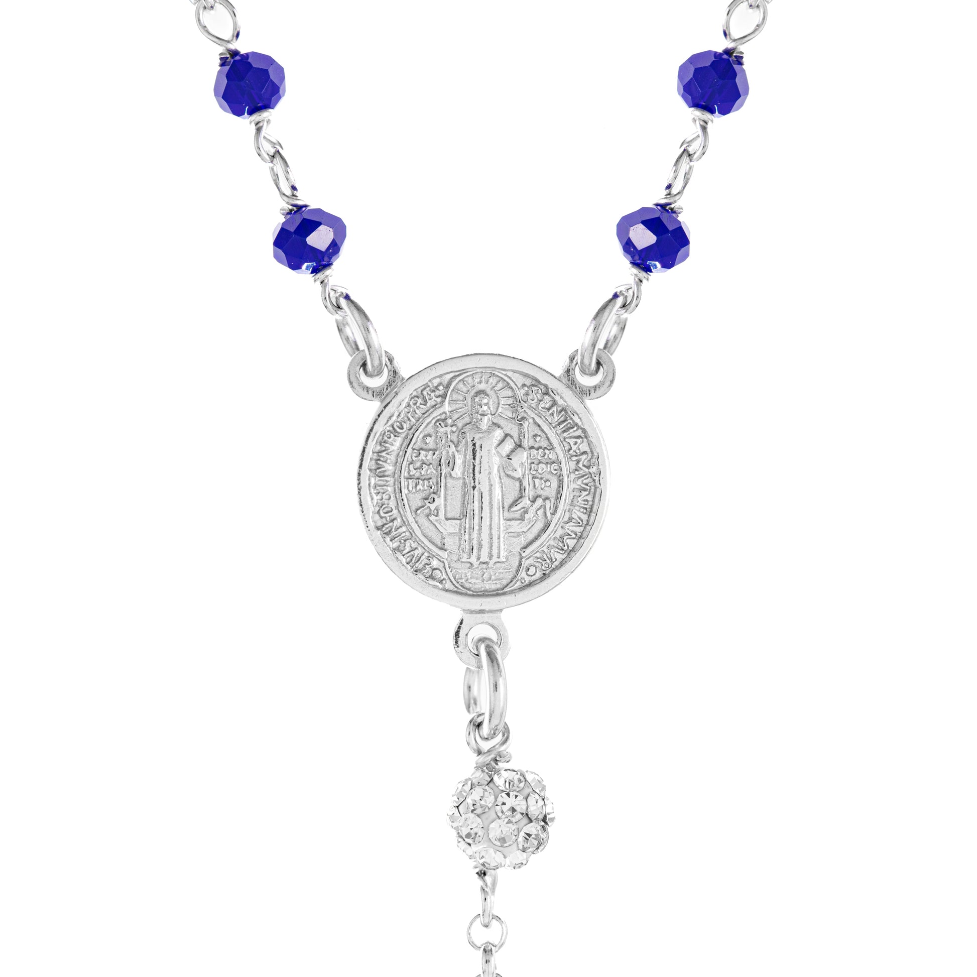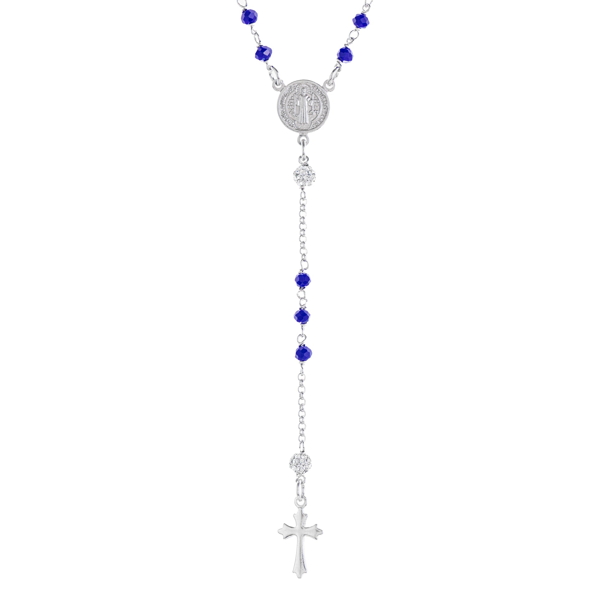 Rosario Argento 925 e Medaglia di San Benedetto. I grani da 3,5 mm, insieme ai grani con cristalli, aggiungono un tocco di eleganza, mentre la presenza della medaglia di San Benedetto conferisce una protezione spirituale. Con una lunghezza di 50cm, questo rosario è perfetto per essere indossato comodamente ogni giorno. L'apertura dell'anello moschettone garantisce una chiusura sicura e senza sforzo, mentre la finitura rodio aggiunge un tocco di luminosità e preziosità al gioiello.