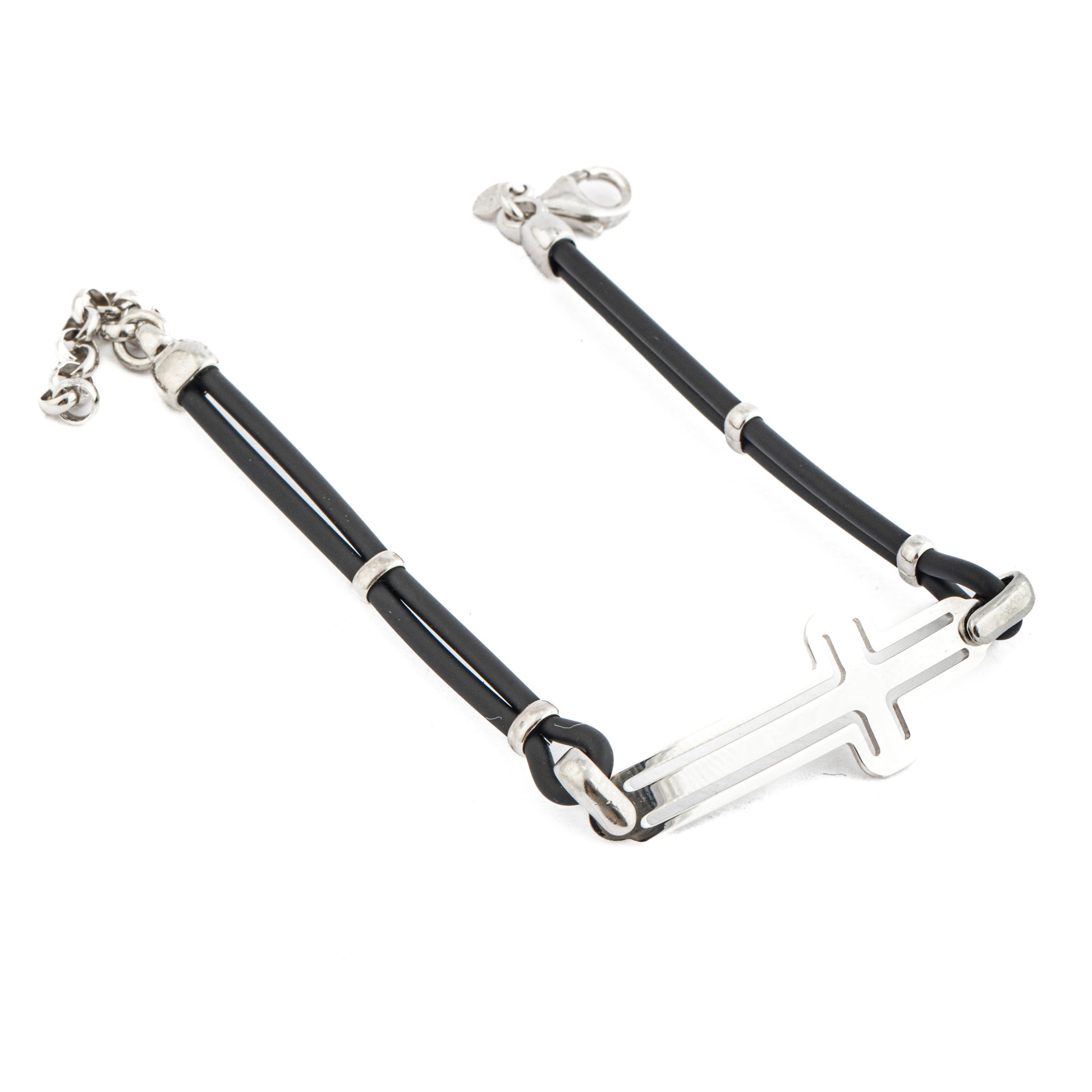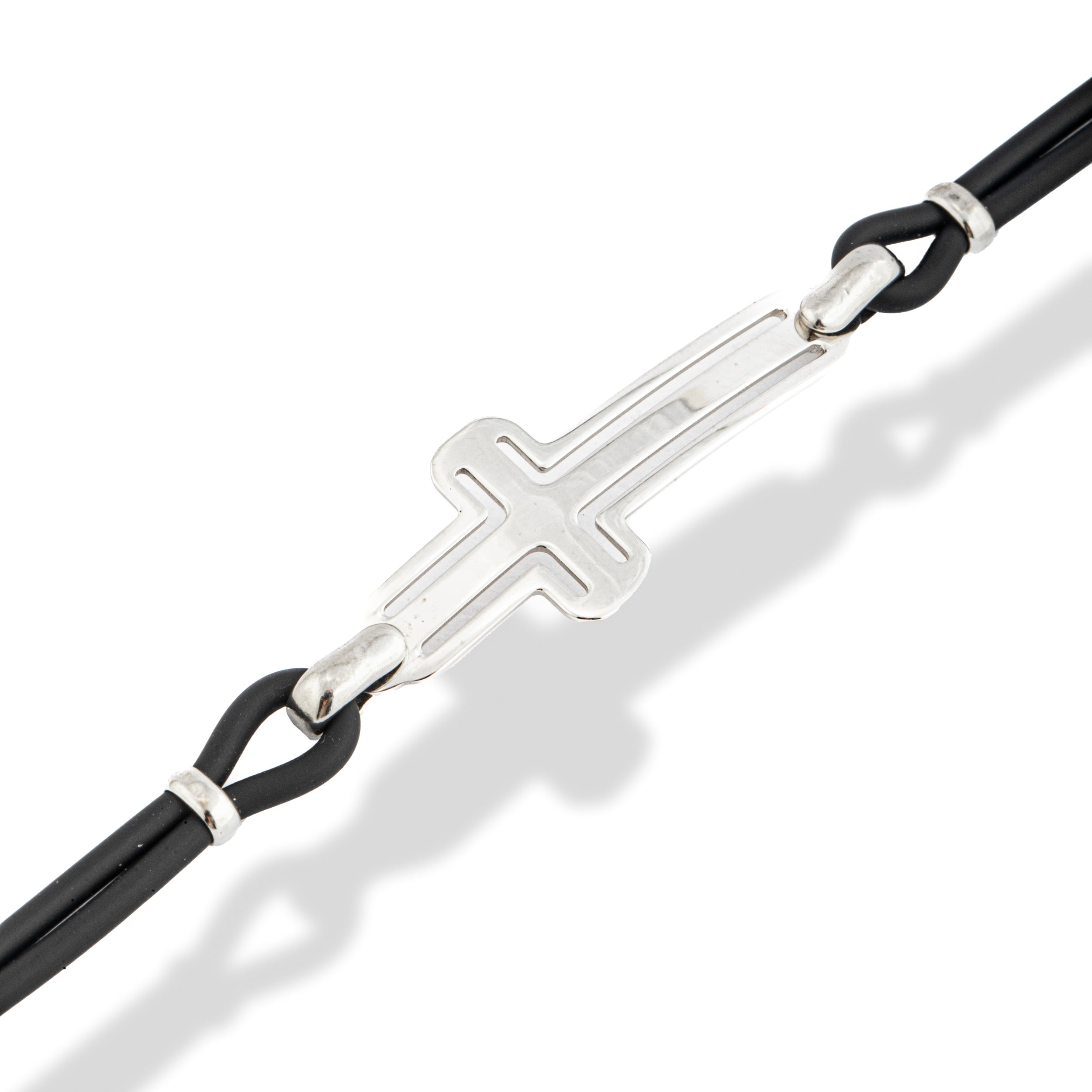 Esclusivo bracciale in caucciù e argento 925 con Croce. Realizzato con materiali di alta qualità. Croce: 3,4cm x 1,6cm. Spessore 1mm. Lunghezza: 17,5cm. Estensione: 3,5cm