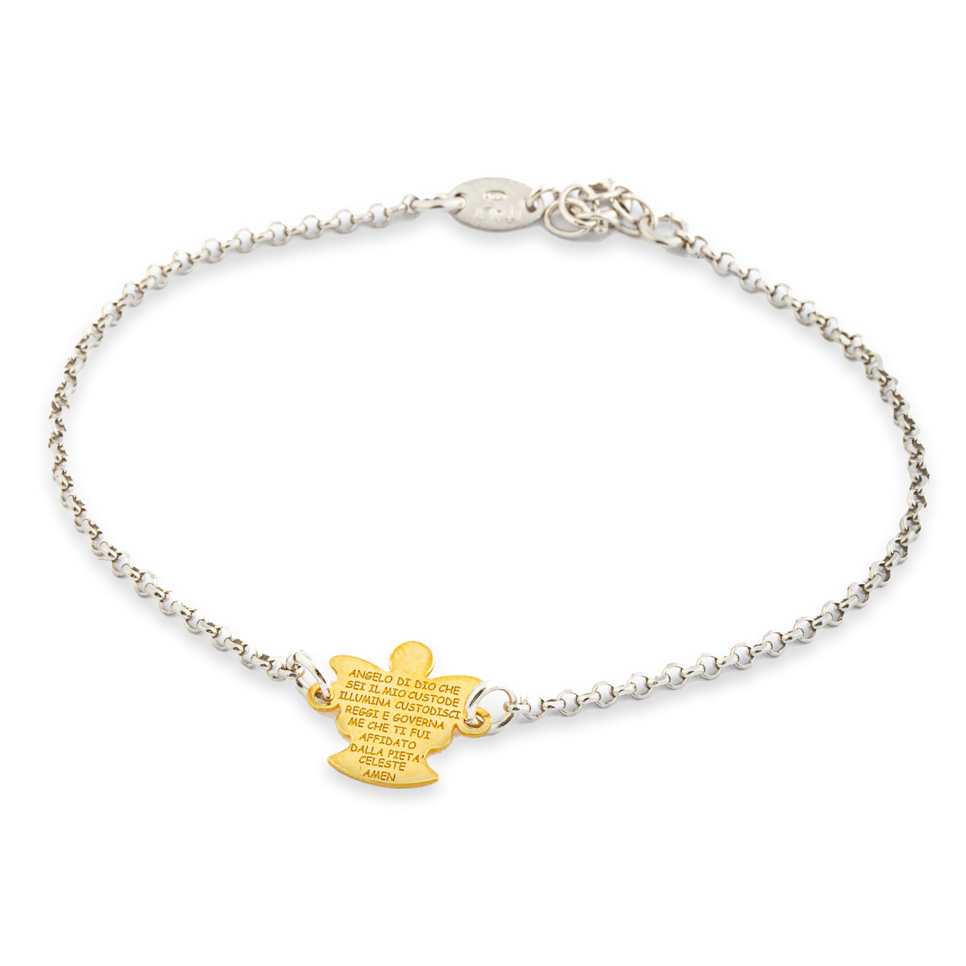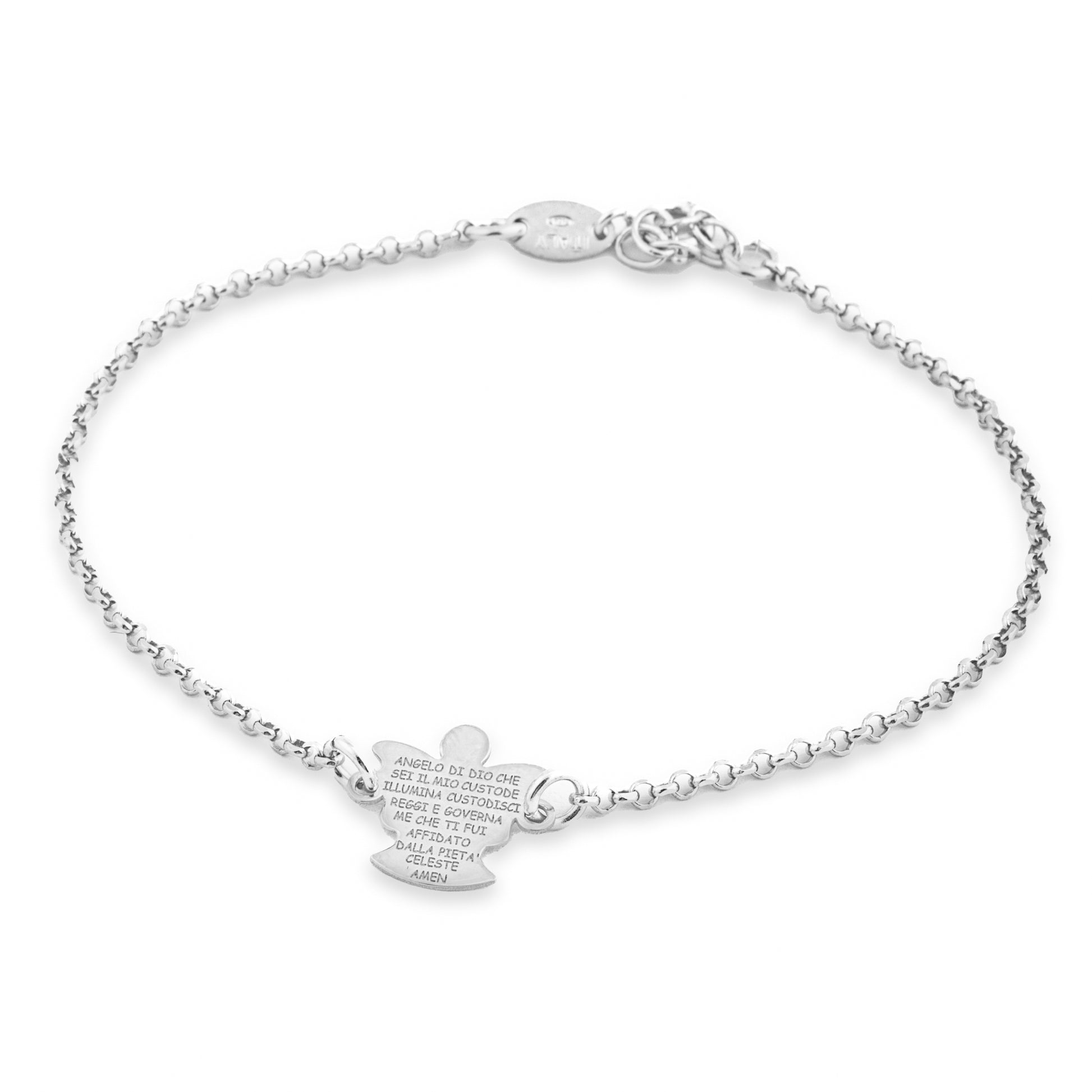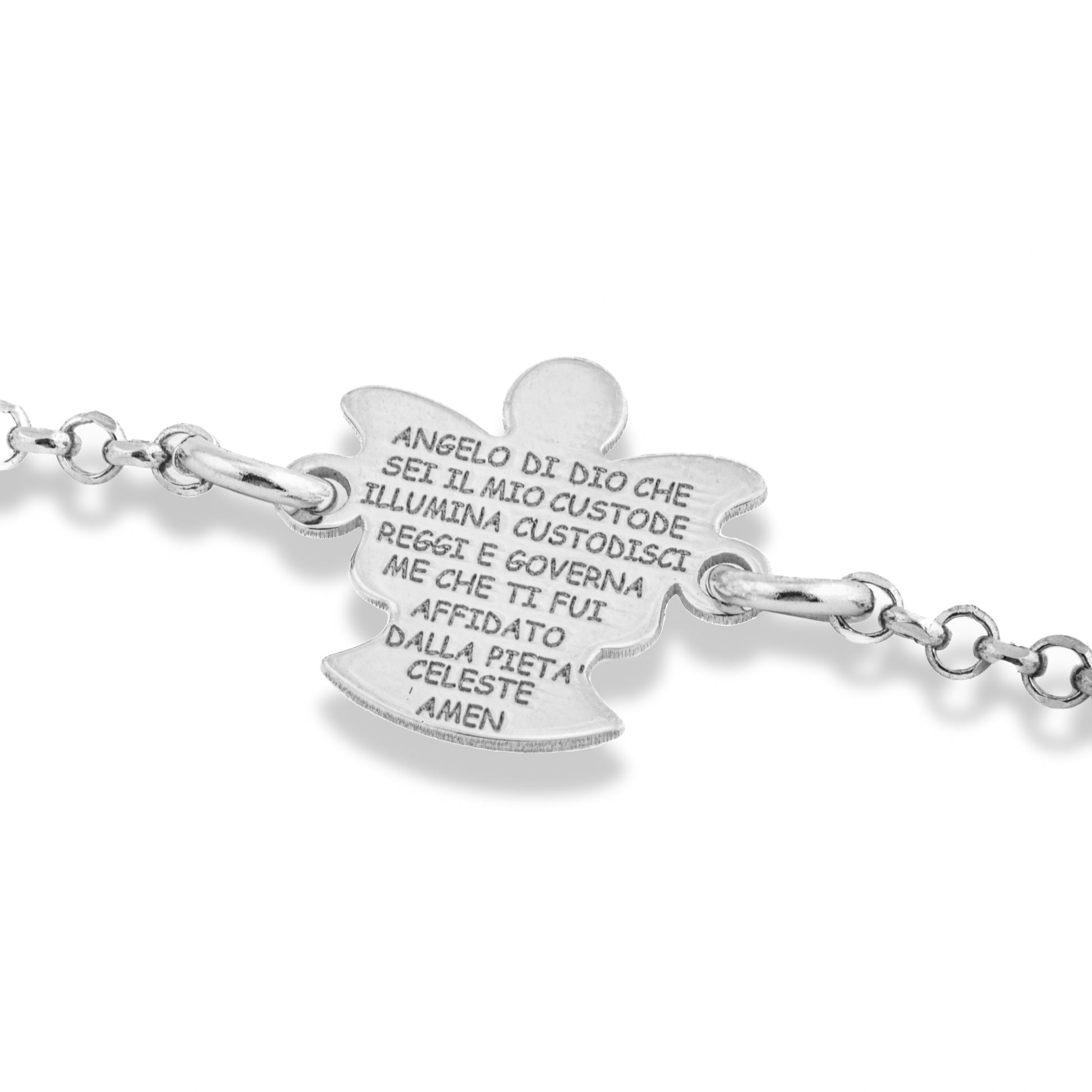 Esclusivo bracciale in argento 925 con maglia rolò e angelo con incisione a laser con preghiera. Realizzato con materiali di alta qualità. Lunghezza: 17cm. Estensione 2,5cm