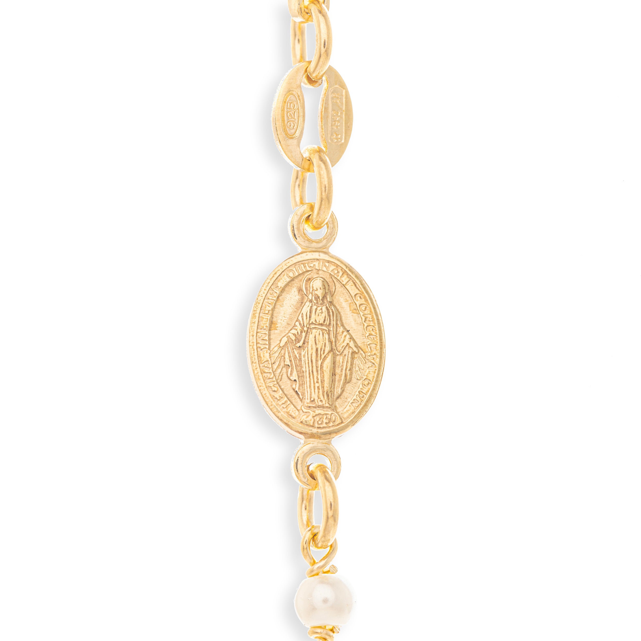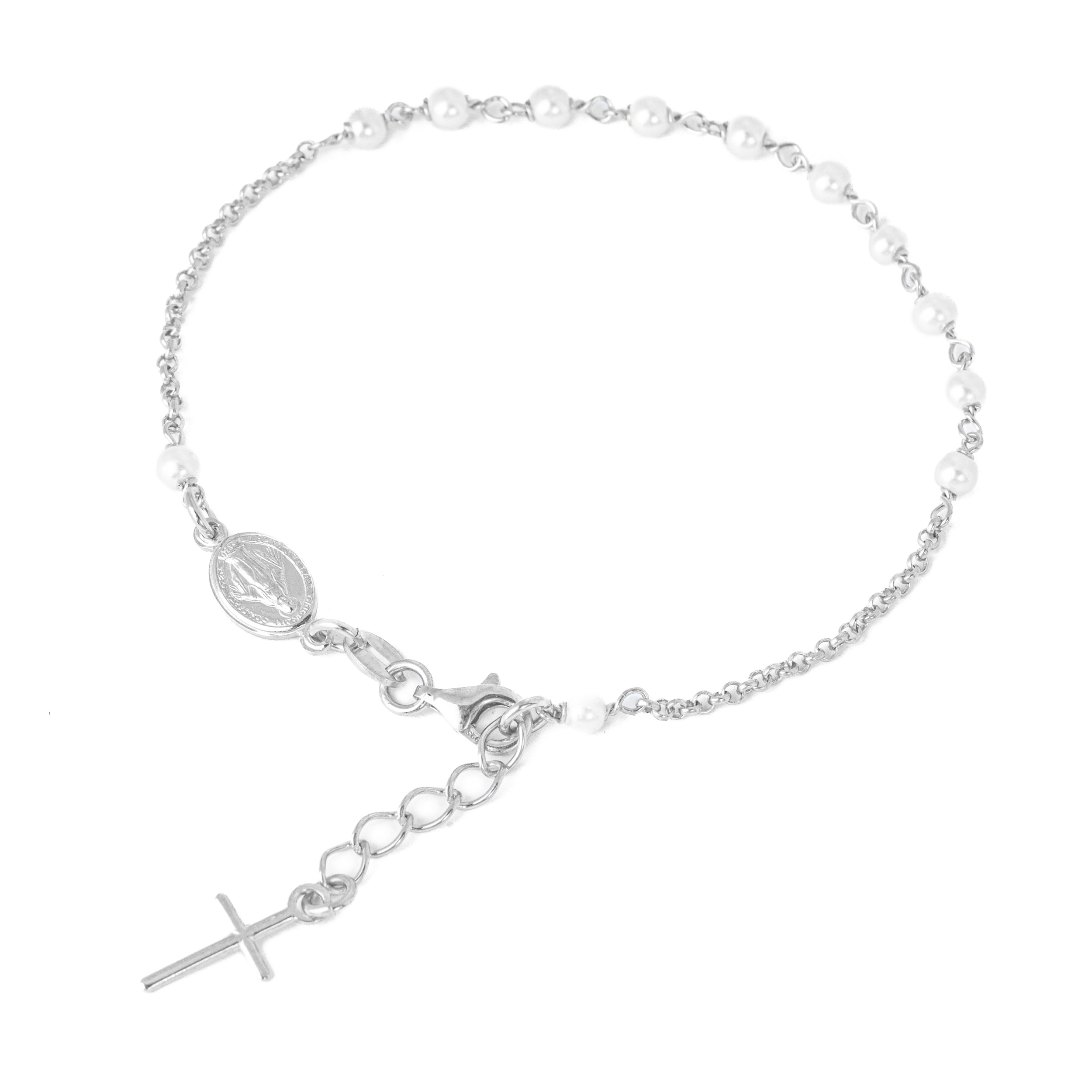 Esclusivo bracciale in argento 925. Con perlina finta da 2,50mm, questo bracciale è impreziosito da una Madonna e una croceta pendente. Realizzato con materiali di alta qualità. Estensione con pendente 3cm