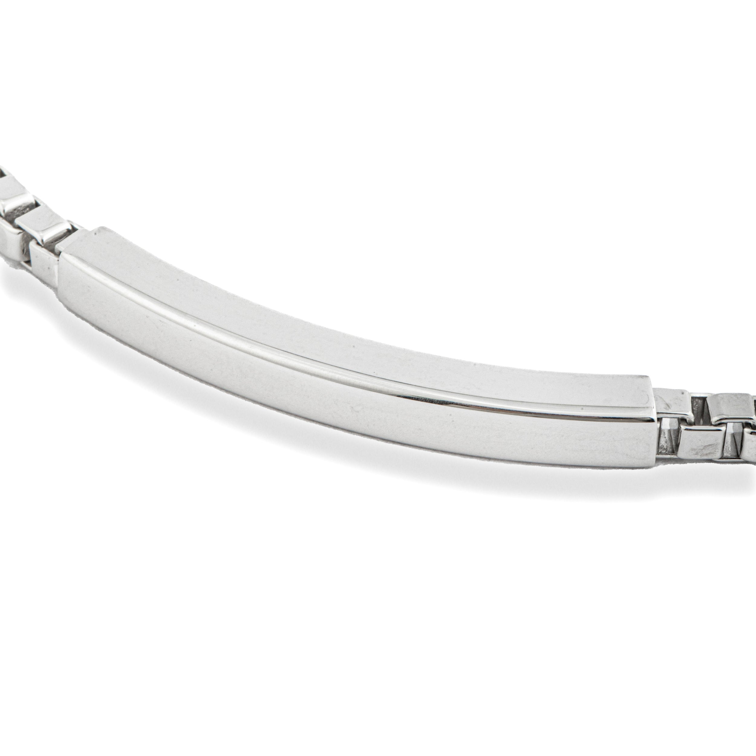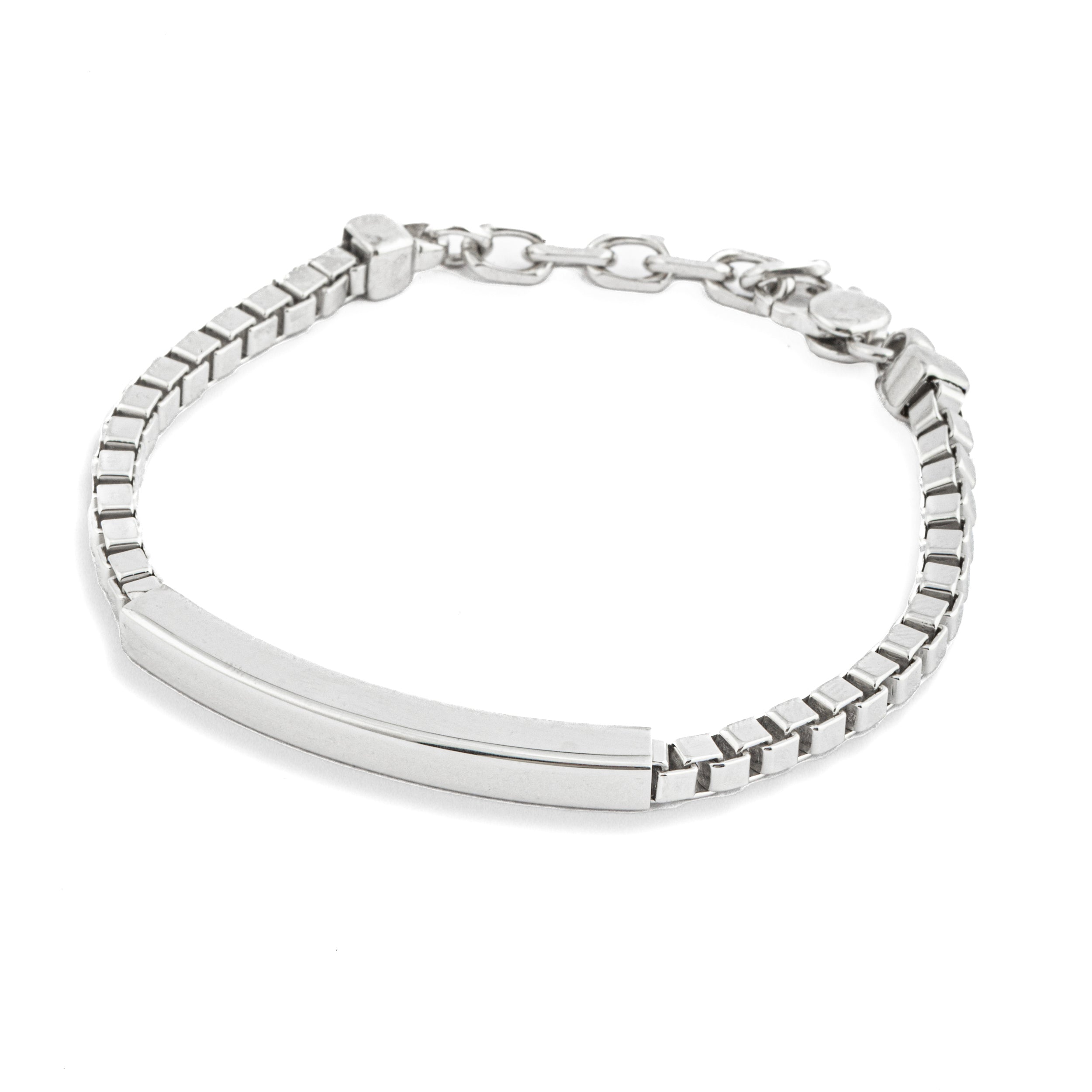 Esclusivo bracciale in argento 925 con piastra centrale sezione quadrata e catena maglia quadra. Con moschettone best. Realizzato con materiali di alta qualità. Lunghezza catena: 18cm, estensione: 3,5cm. Piastra: 4,2cm x 5mm x 5mm